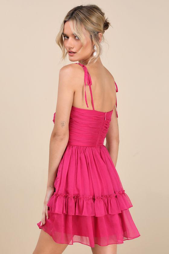 Designed to keep the compliments coming, this vibrant dress has an airy woven chiffon construction that shapes a skater-style silhouette with a gathered bodice, sweetheart neckline, and adjustable tying straps at the shoulders. Ruffled trim accents the mini skirt for an extra adorable finish. Hidden back zipper/clasp.