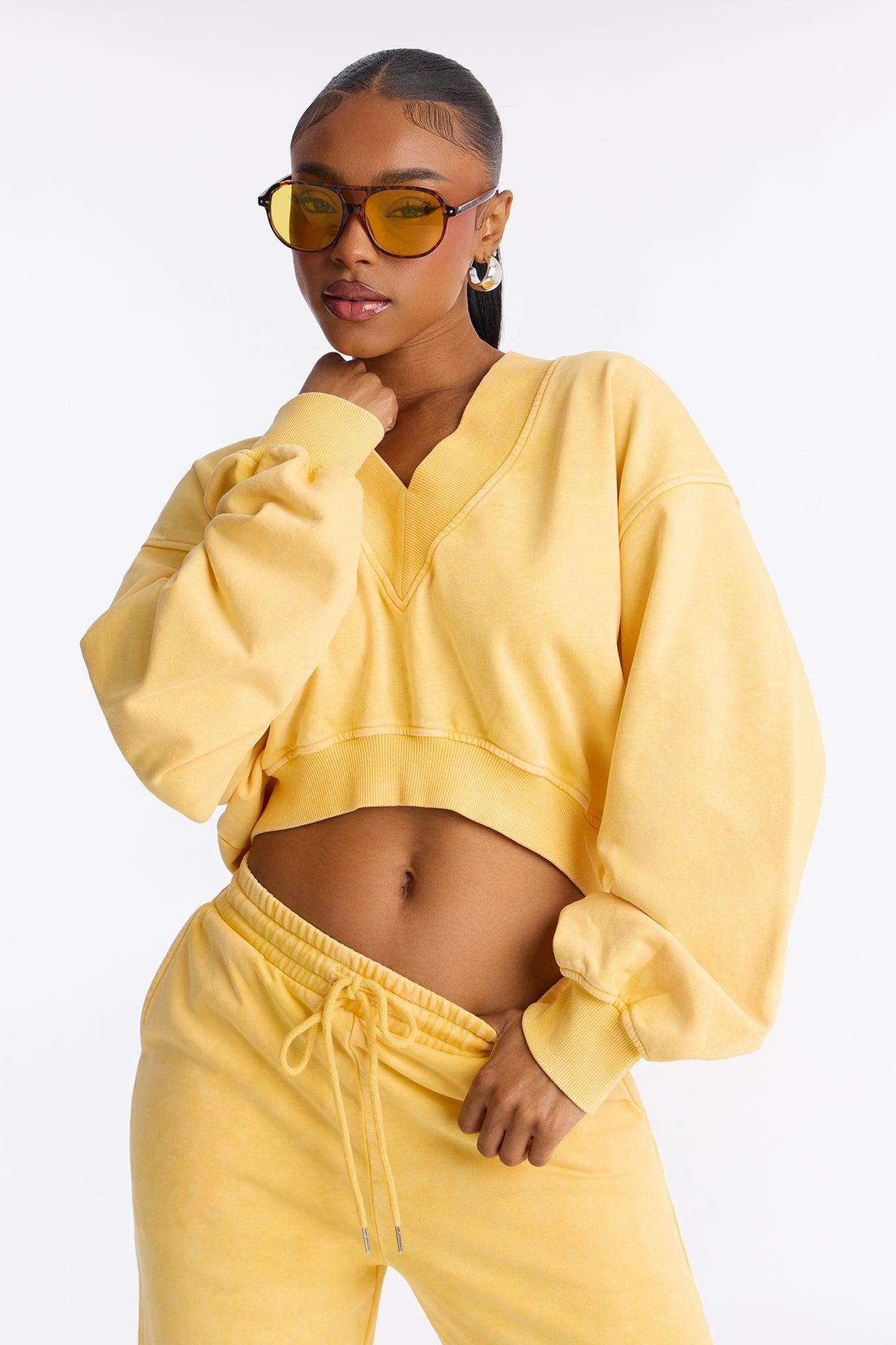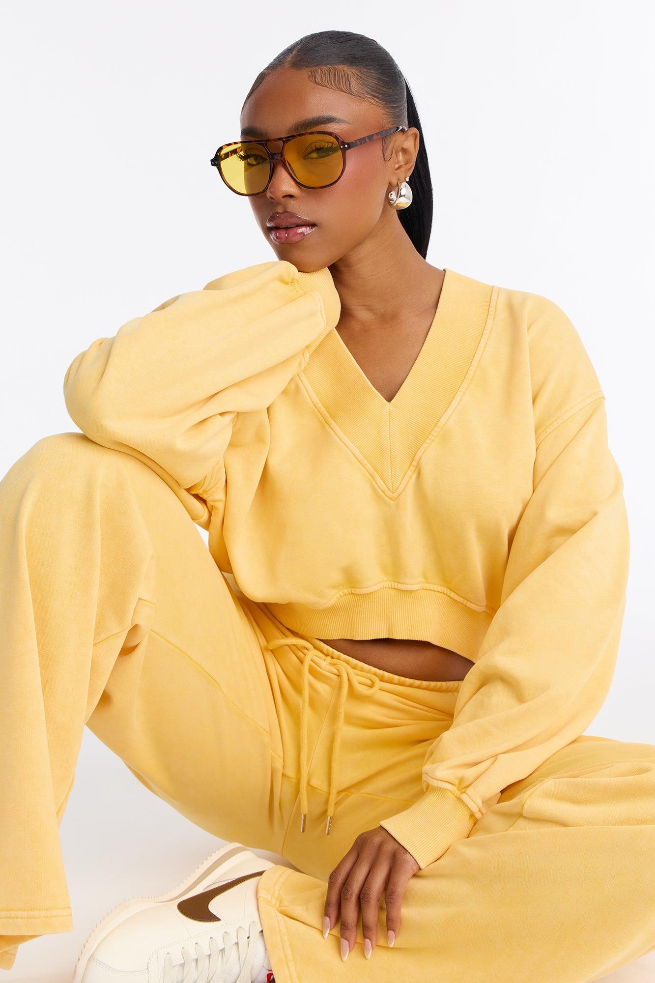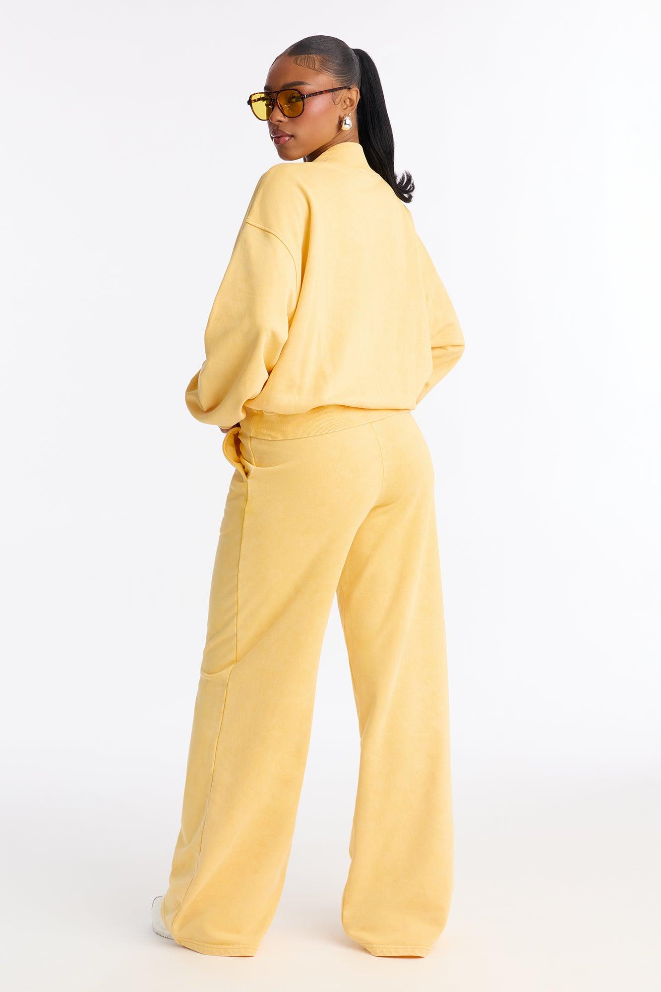 Available In Navy, Raspberry And Yellow. 2 Piece Ensemble Sweatshirt Crew Neck And Wide Leg Pant Set Stretch 33" Inseam Elastic Waistband With Drawstring Pockets Disclaimer: Due To The Specialized Wash Process, Each Garment Is Unique. Self: 85% Cotton 15% Polyester Imported