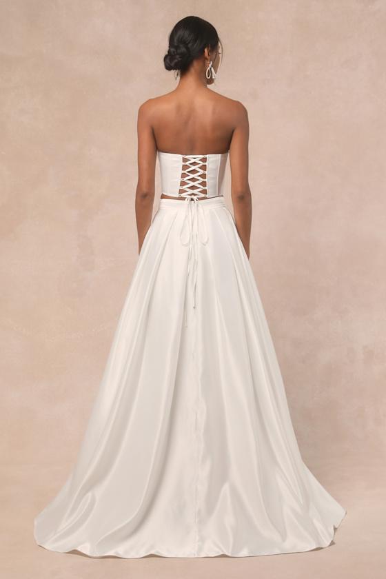 Thanks to this satin three-piece bridal dress set, you can go from reciting your vows to dancing the best night of your life away in an instant! Start with the voluminous, ballgown-inspired maxi skirt to strut down the aisle in and quickly transition into a sleek A-line mini option to get the party started. Top it off with the strapless, bustier-style bodice featuring supportive boning, a lace-up design at the back, and a timeless Basque waist for the most positively stunning finish. Your bridal order will arrive with one branded canvas garment bag included for storage and protection.