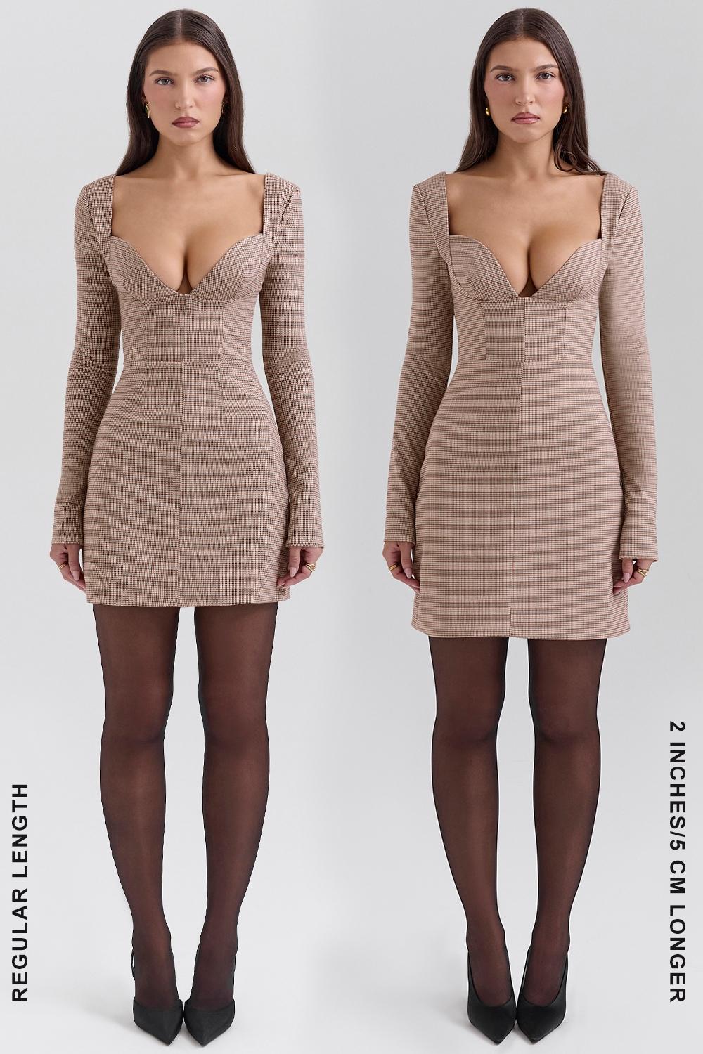 Get ready to turn heads in our 'Angelie' Mini Dress—a showstopper that combines elegance with a sultry edge and one that's a striking addition to the Enchanted Hour collection. Cut from our adorable Puppytooth check, that we developed especially for this season, 'Angelie' gives a nod to British heritage dressing and cosy Fall vibes. We love her teamed with soft warm tights and equestrian boots but she's equally at home with heels and a clutch for elegant and chic dinner dates