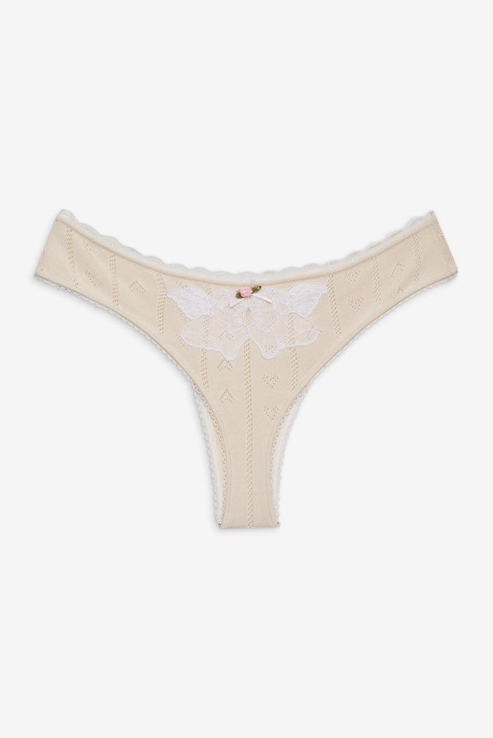 Crafted in a soft knit pointelle, the Angelina cream knit panty is an everyday basic with a romantic edge. This thong style offers cheeky coverage and spotlights dreamy details from rosette and satin bow trims to a cherub appliqué at the back. Pair it with the matching Angelina Knit Tank Top for a complete set.