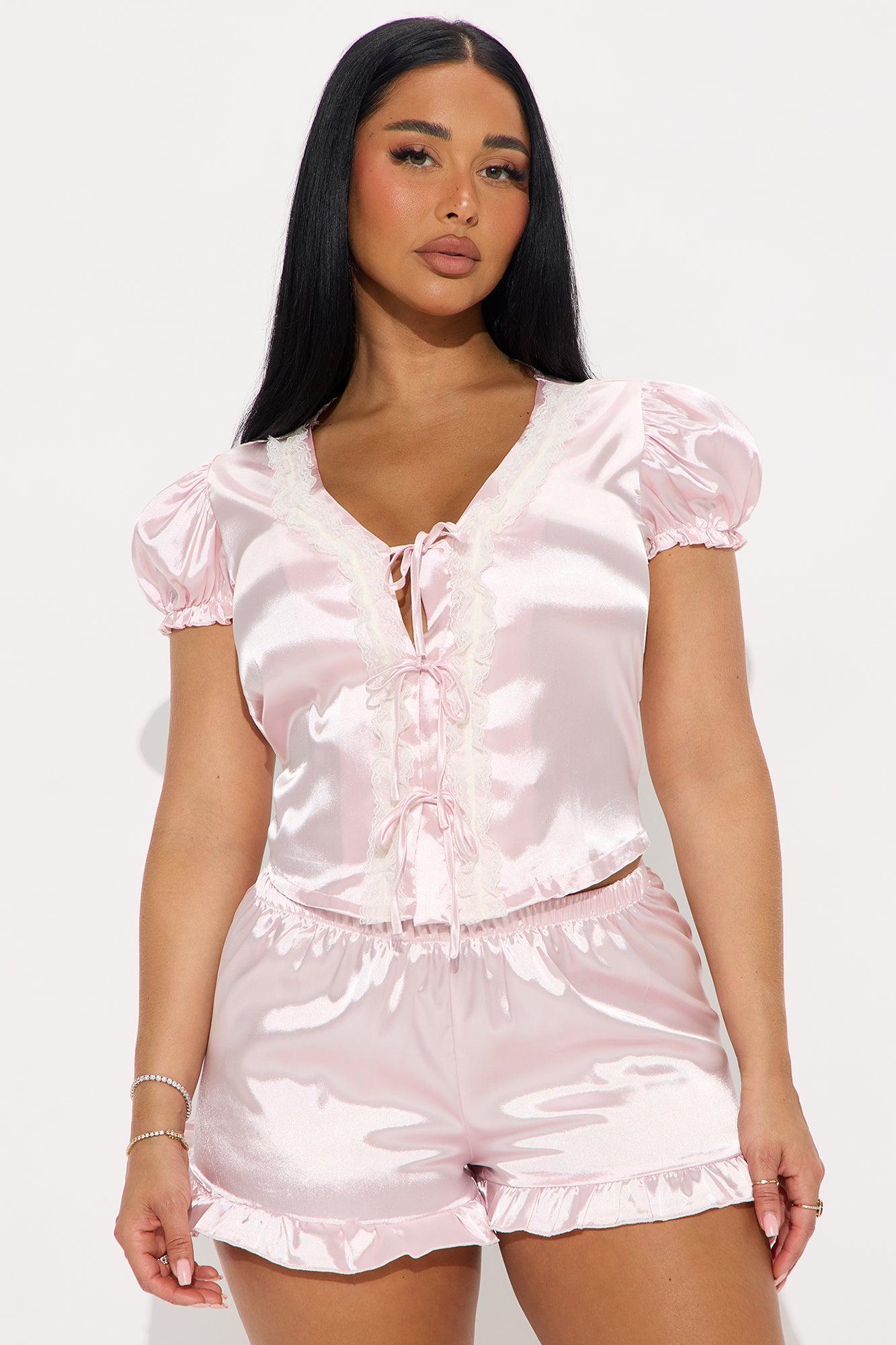 Available In Blush. PJ Short Set Short Sleeve Top Puff Sleeves Tie Front Lace Trim Matching Shorts Elastic Waistband Ruffle Detail Light Stretch Final Sale Shell: 97% Polyester 3% Spandex Lace: 100% Polyester Imported California Proposition 65WARNING: Cancer and Reproductive Harm - www.P65Warnings.ca.gov.