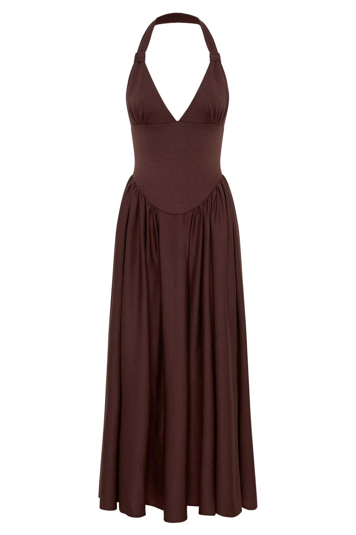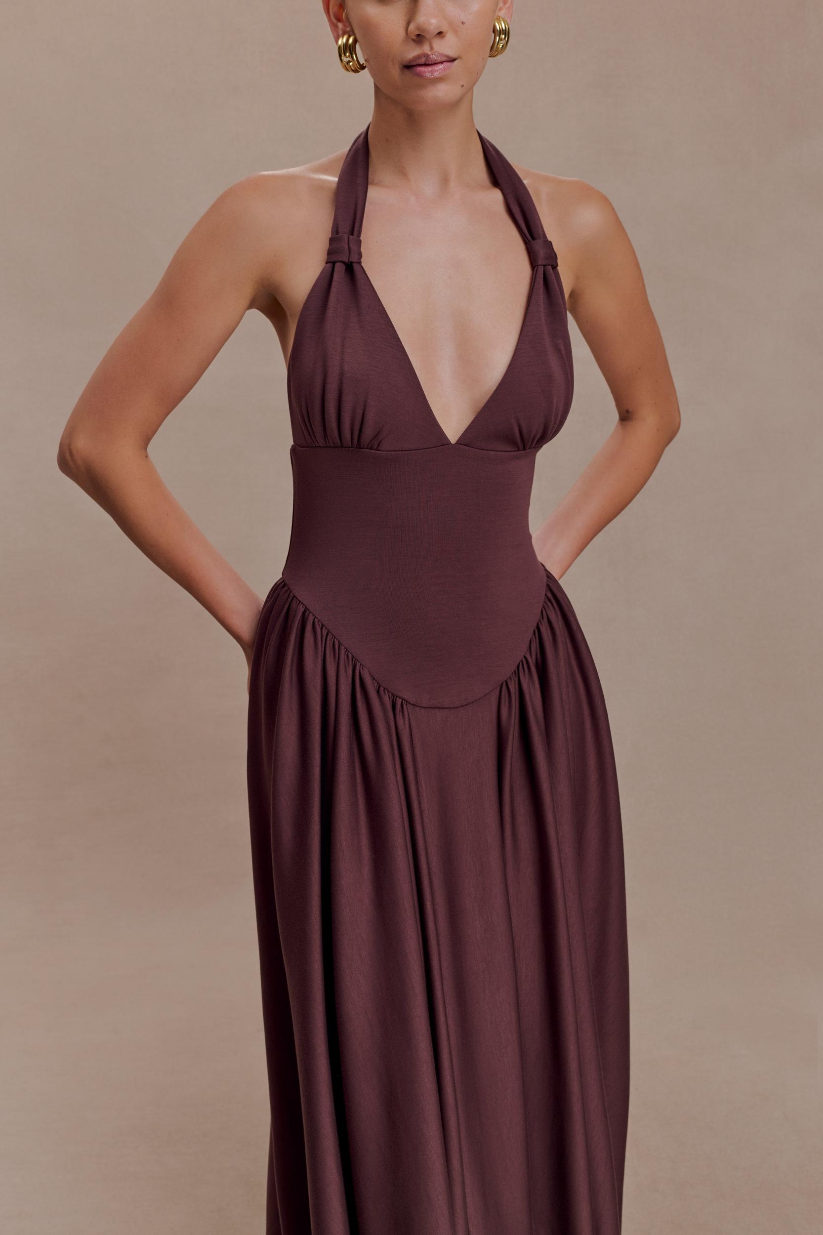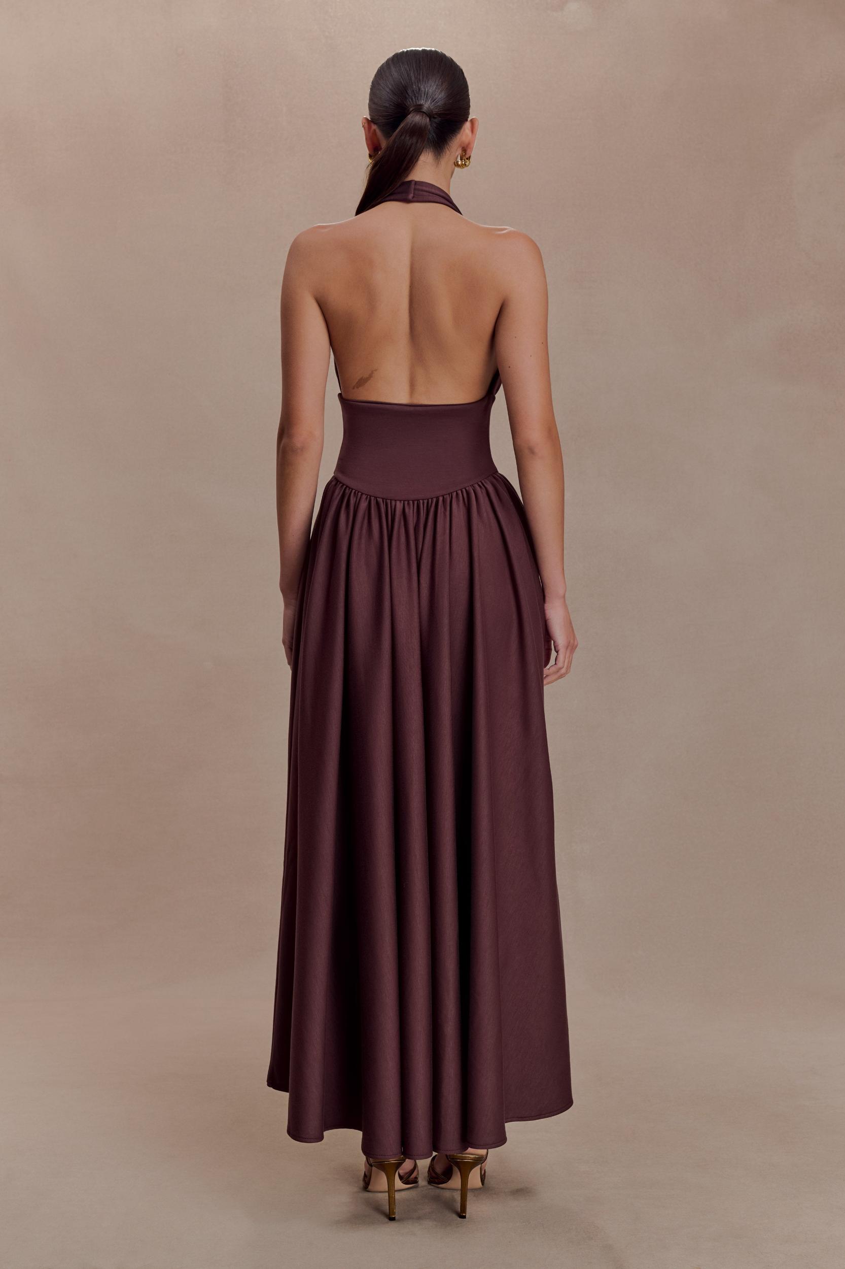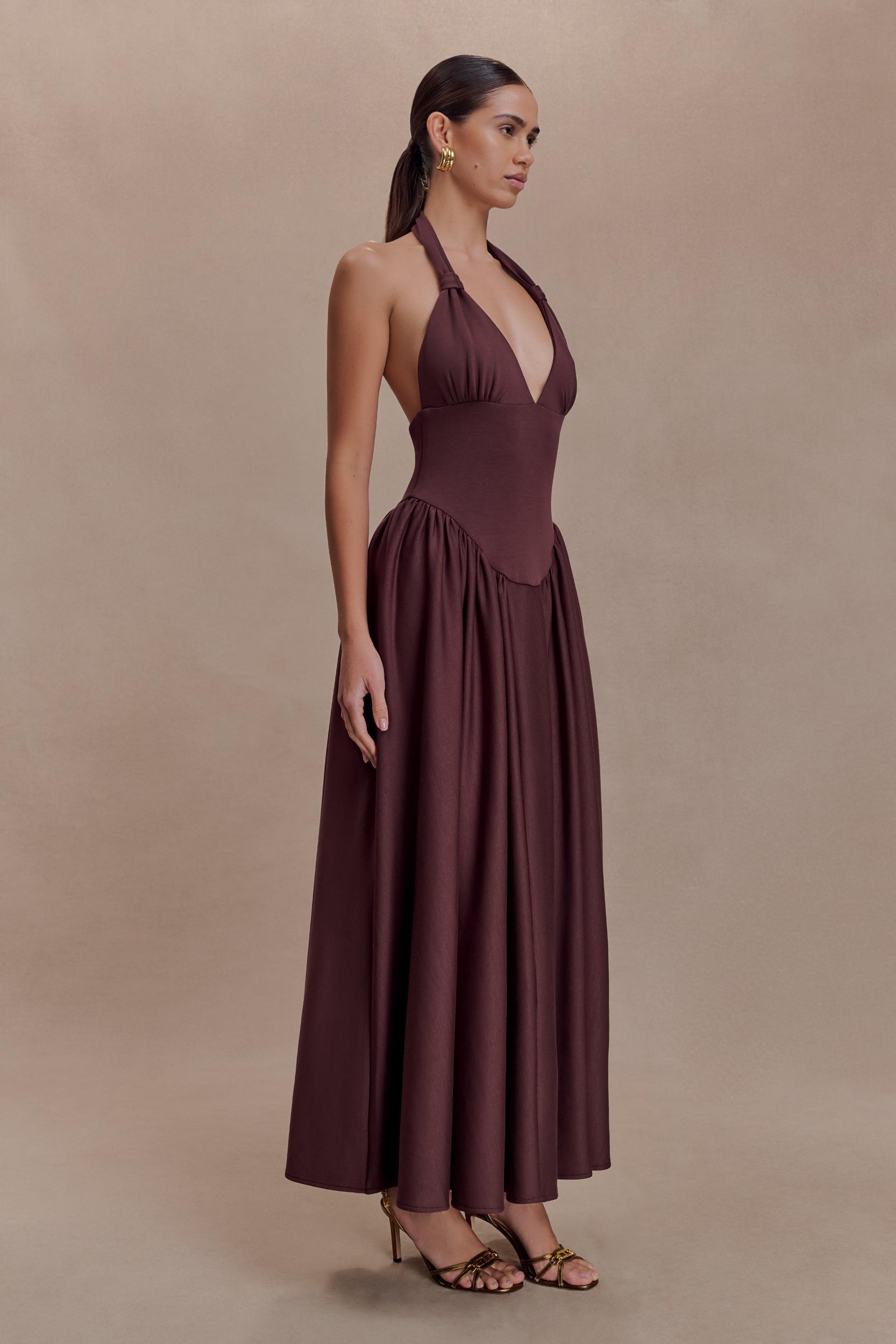 A silhouette that holds its own. The ANGELINA Scuba Halter Midi Dress is designed to sculpt and support with modern precision. Featuring an adjustable halter neckline and an open back, it balances clean structure with confident allure. Crafted in a smooth scuba fabrication, the fitted bodice is shaped with a curved waist seam that enhances and flatters the figure, while the full skirt adds volume and movement through the midi-length silhouette. Fully lined for comfort and finish, this dress is thoughtfully designed to be big bust approved, offering both support and style for elevated occasion dressing.