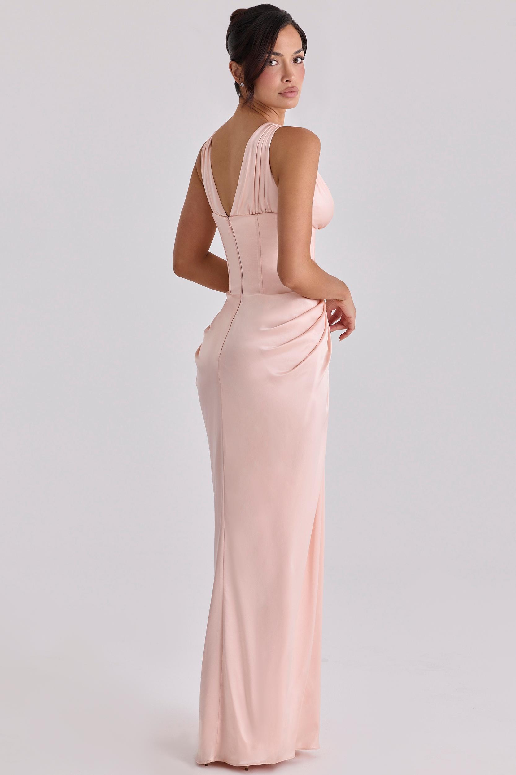 Where fluidity meets form – 'Angeline' offers a masterclass in dress making. The statement shape is crafted from luxe satin with a lustrous finish and delicate details for an hourglass silhouette. The bodice is thoughtfully fitted with boning and stretch panels that cinch the waist, and soft gathered cups enhance the sultry plunge shape that moulds effortlessly to your curves.