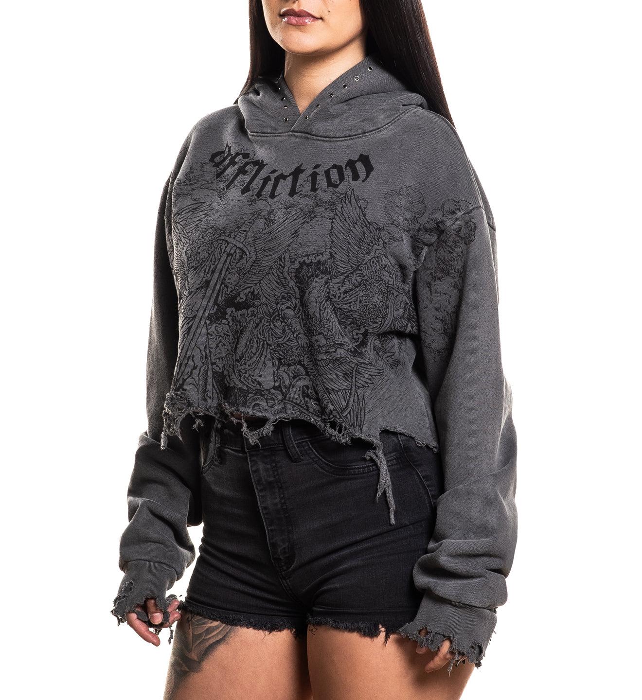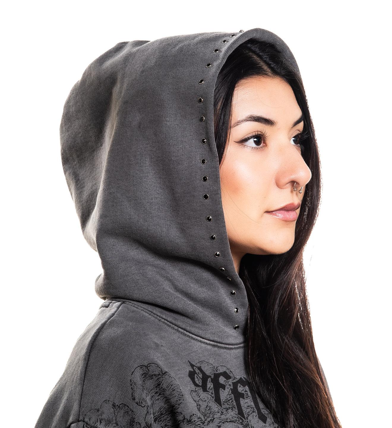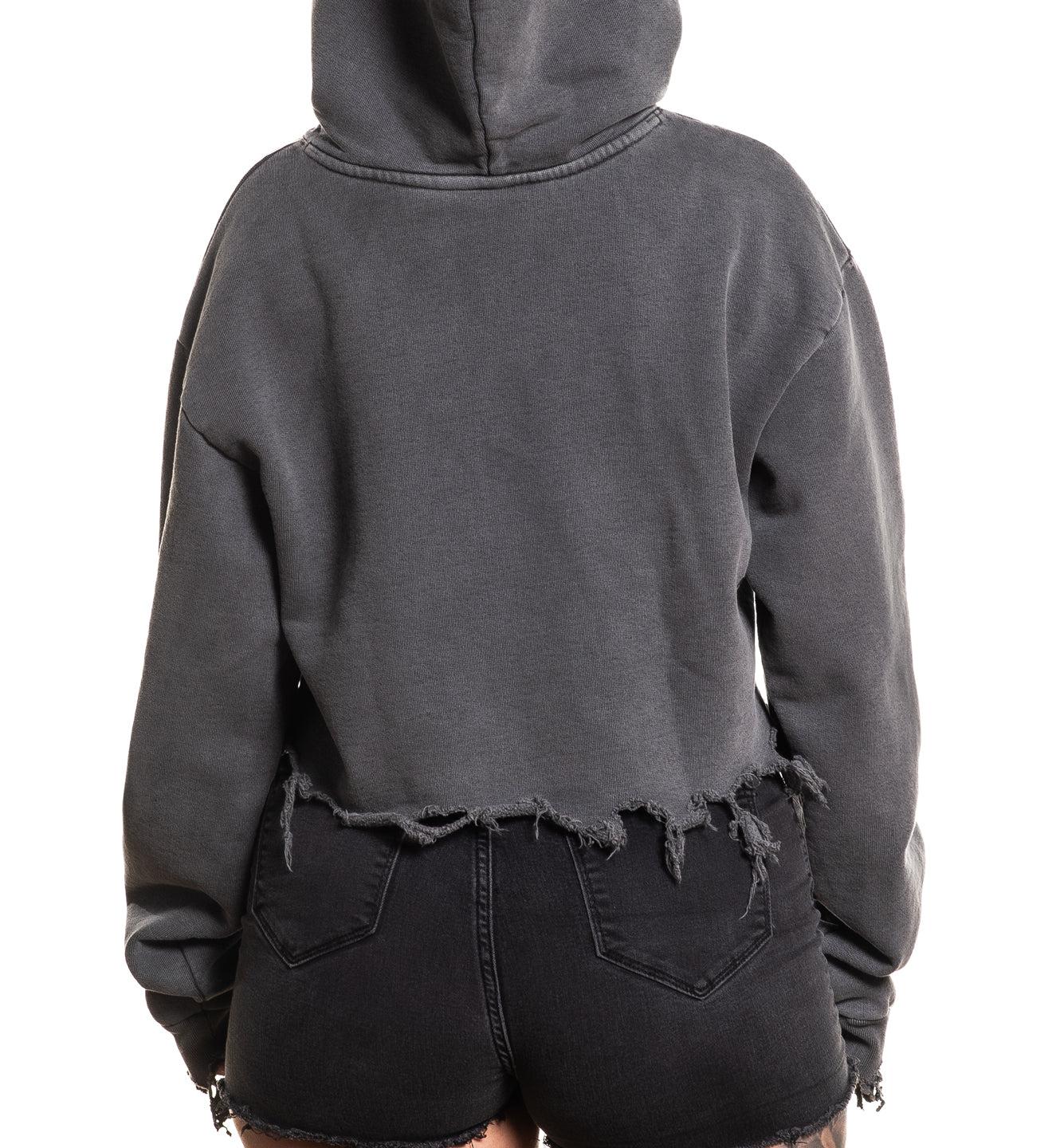 Affliction Angels Long Sleeve Crop Hoodie Vintage Black Pigment Dye Wash Sleeve Destruction and Grinding Black rim set single row of rhinestones Model wearing size S