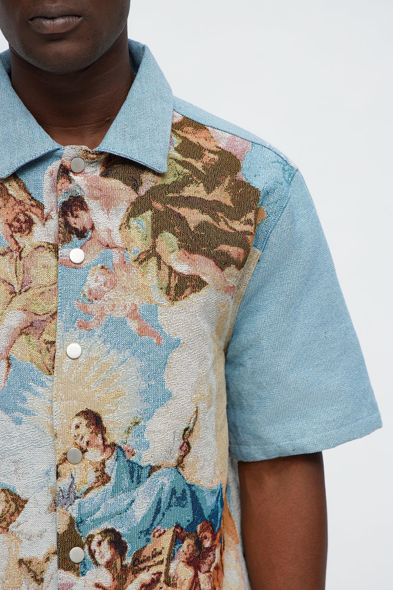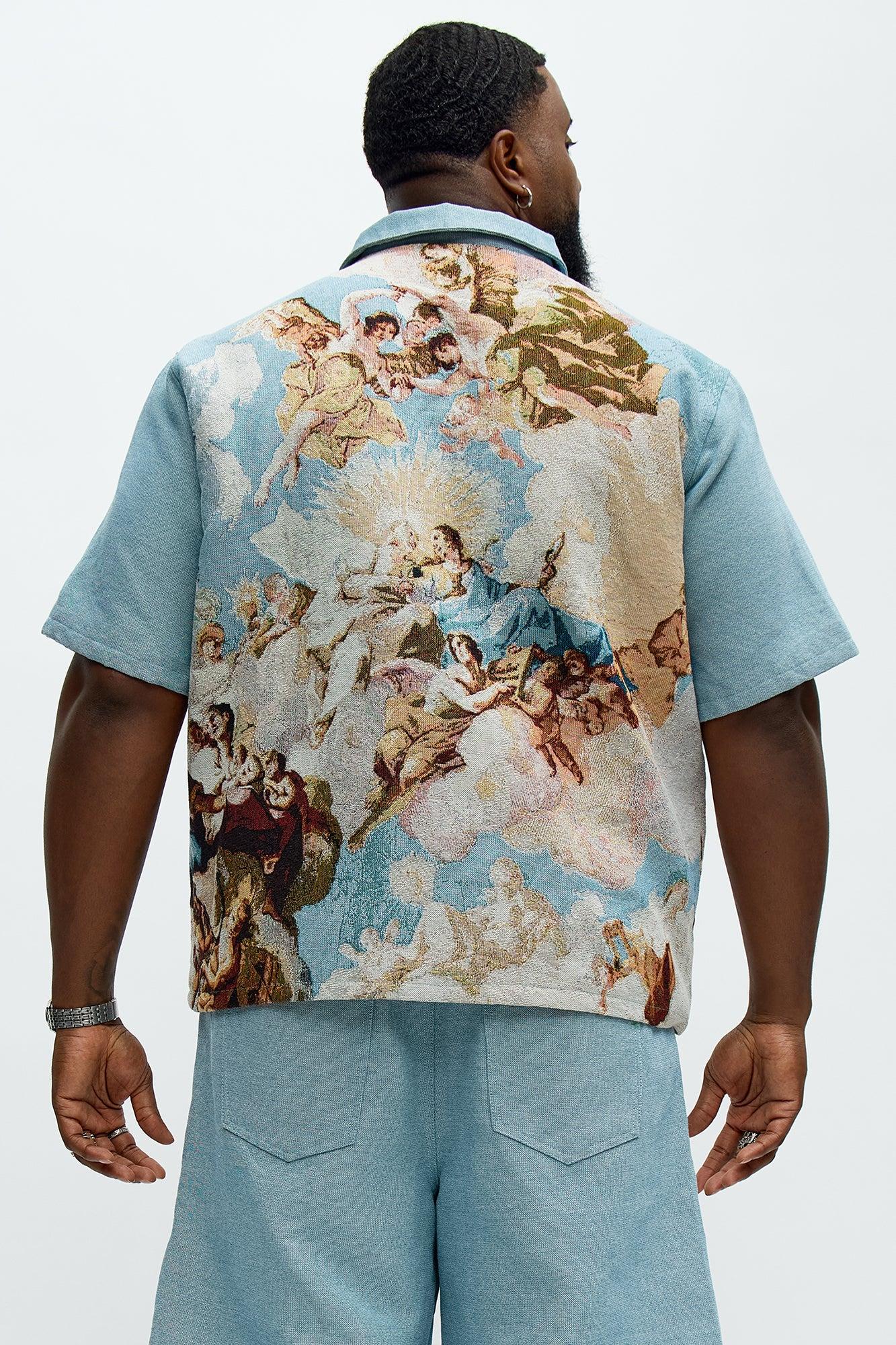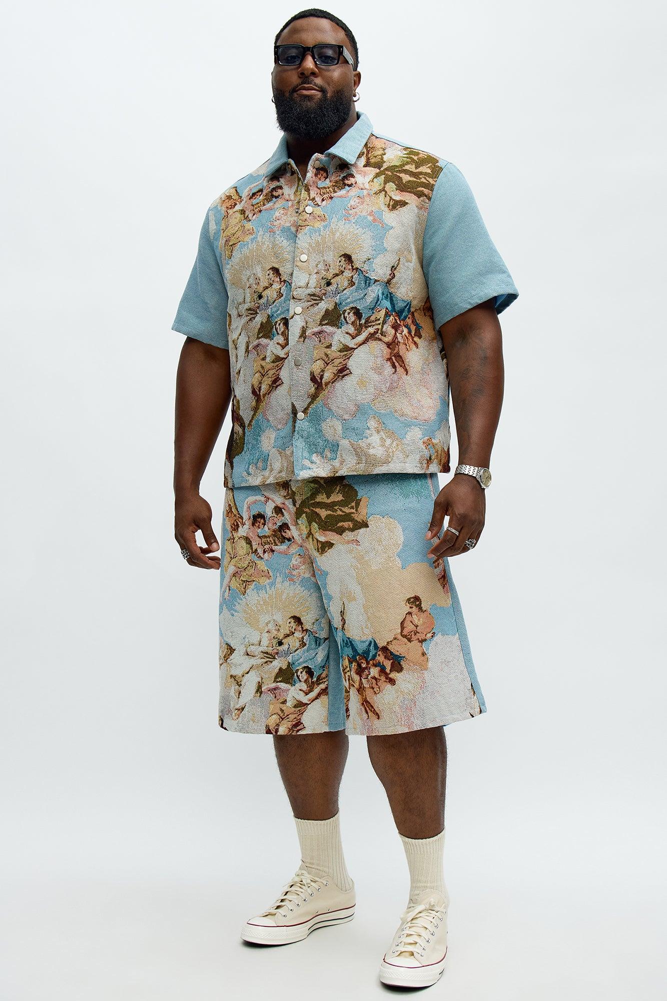 Available In Blue/combo. Fold Down Collar Front Button Closure Short Sleeves Pair With "Baggy Angels Tapestry Short" Disclaimer: Print Placement May Vary Shell: 80% Polyester 20% Cotton Lining: 100% Polyester Imported California Proposition 65WARNING: Cancer and Reproductive Harm - www.P65Warnings.ca.gov.