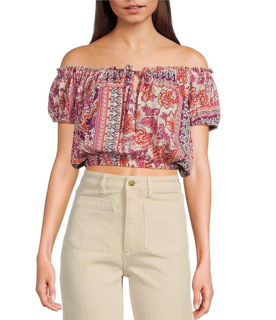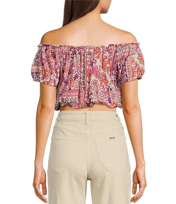 Angie Patch Print Off-The-Shoulder Cap Sleeve Crop Top