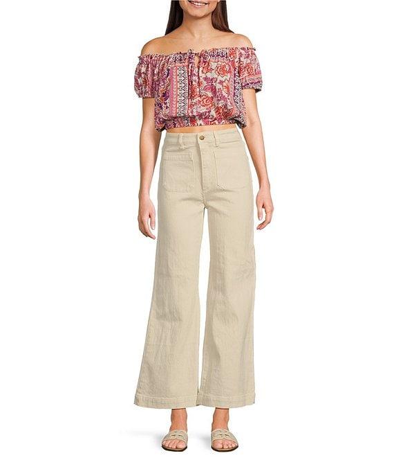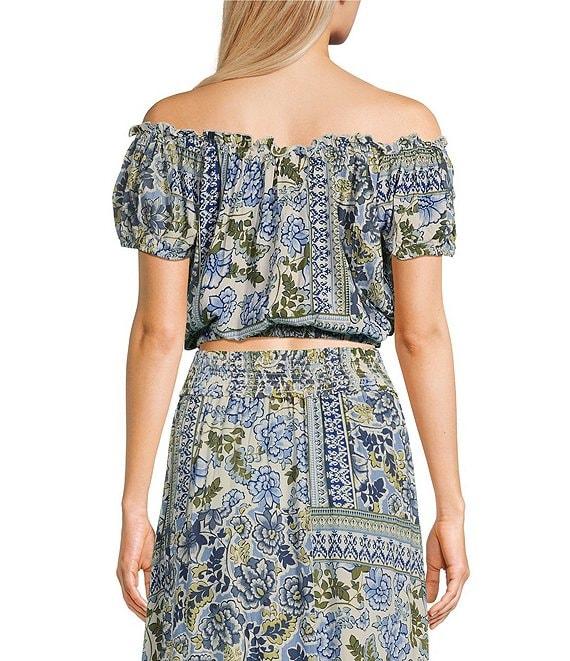 From Angie, this top features: All-over patch print Short cap sleeves Off-the-shoulder Pullover styling Cropped length Rayon Hand wash/drip dry Imported.