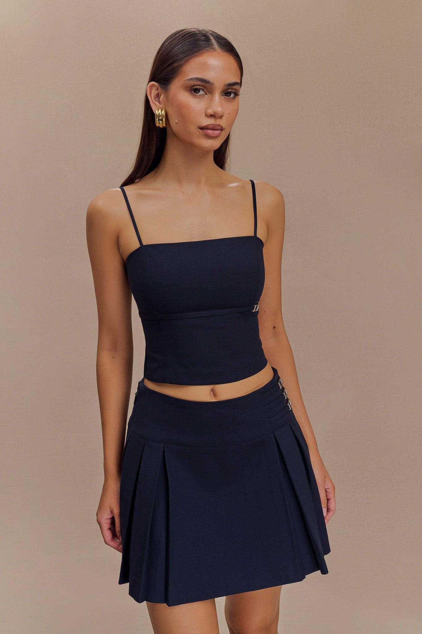 Timelessly tailored.The ANGIE Pleated Buckle Mini Skirt is a playful yet polished addition to your wardrobe, designed to turn heads. This skirt features a wide waistband with a striking buckle detail, adding a touch of sophistication and a flattering fit. The side zip and hook-and-eye closure ensure a seamless silhouette, while the pleated design and mini length create a dynamic, feminine shape. For a chic daytime look, pair it with the Aberley Crop Top, or elevate the ensemble with the Bellamy Cinched Blazer for a sleek, tailored finish that's perfect for any occasion.