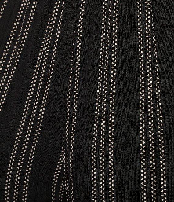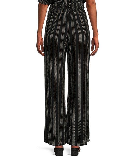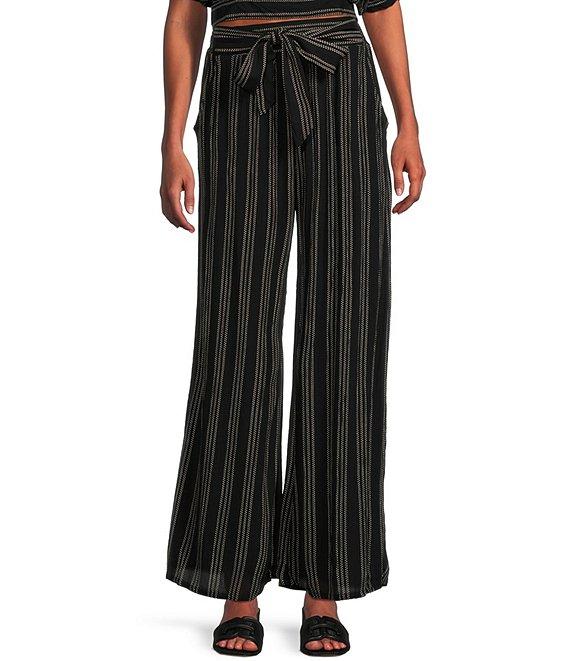 From Angie, this pant features: Linear print Mid rise Tie front detail Elastic back waist Wide leg Pull-on styling Approx. 29.5" inseam length Rayon Hand wash Imported.
