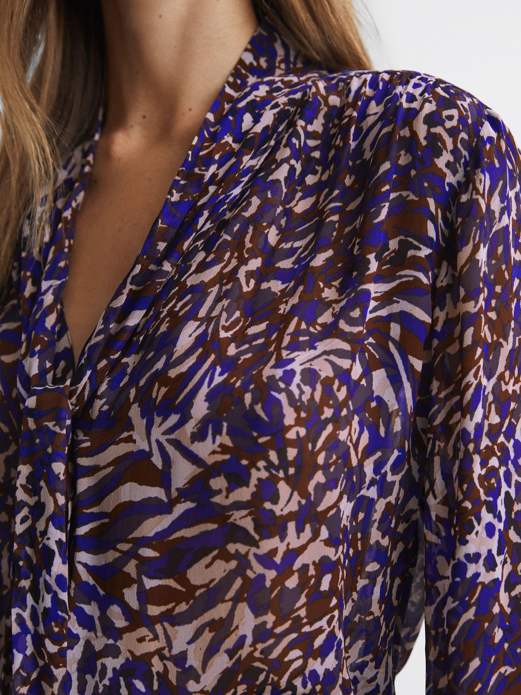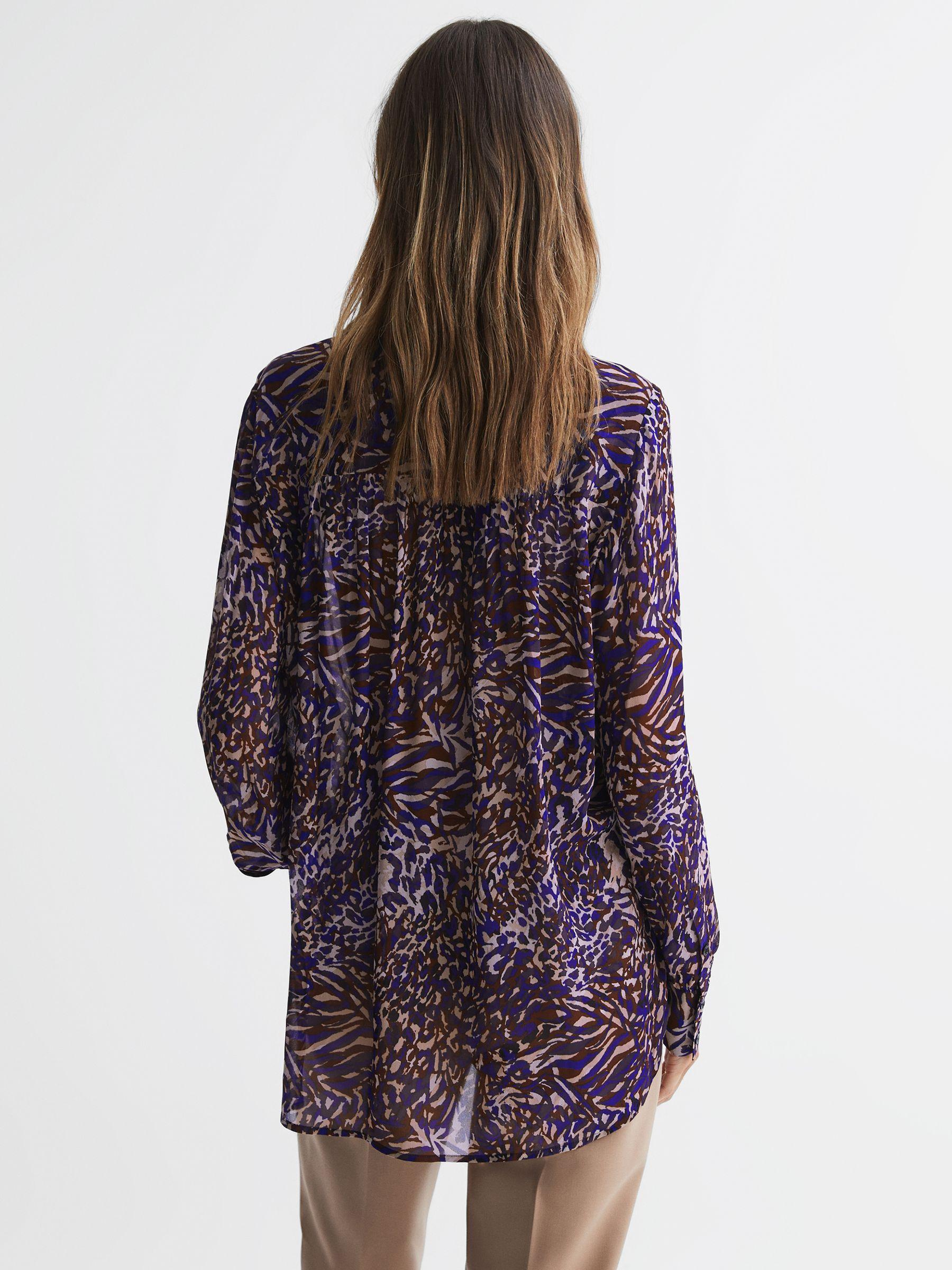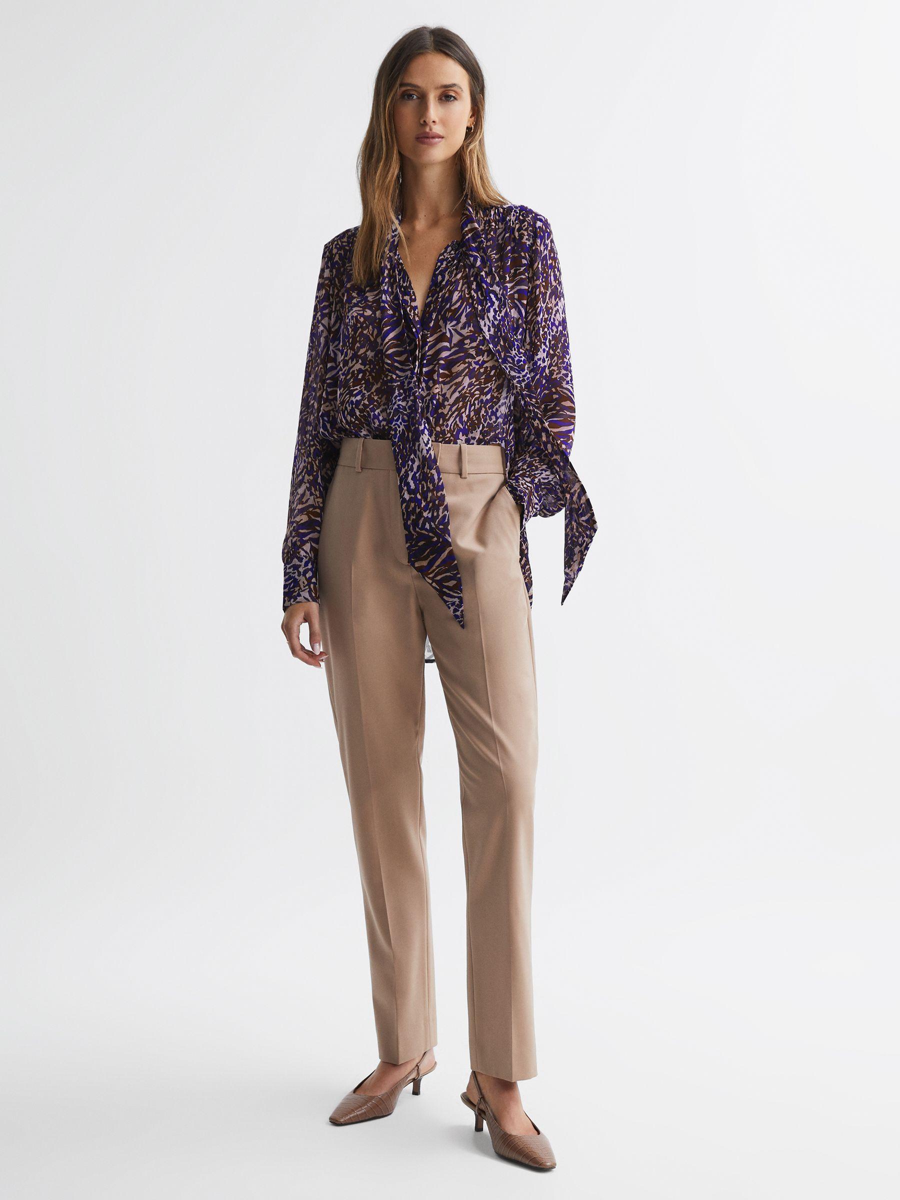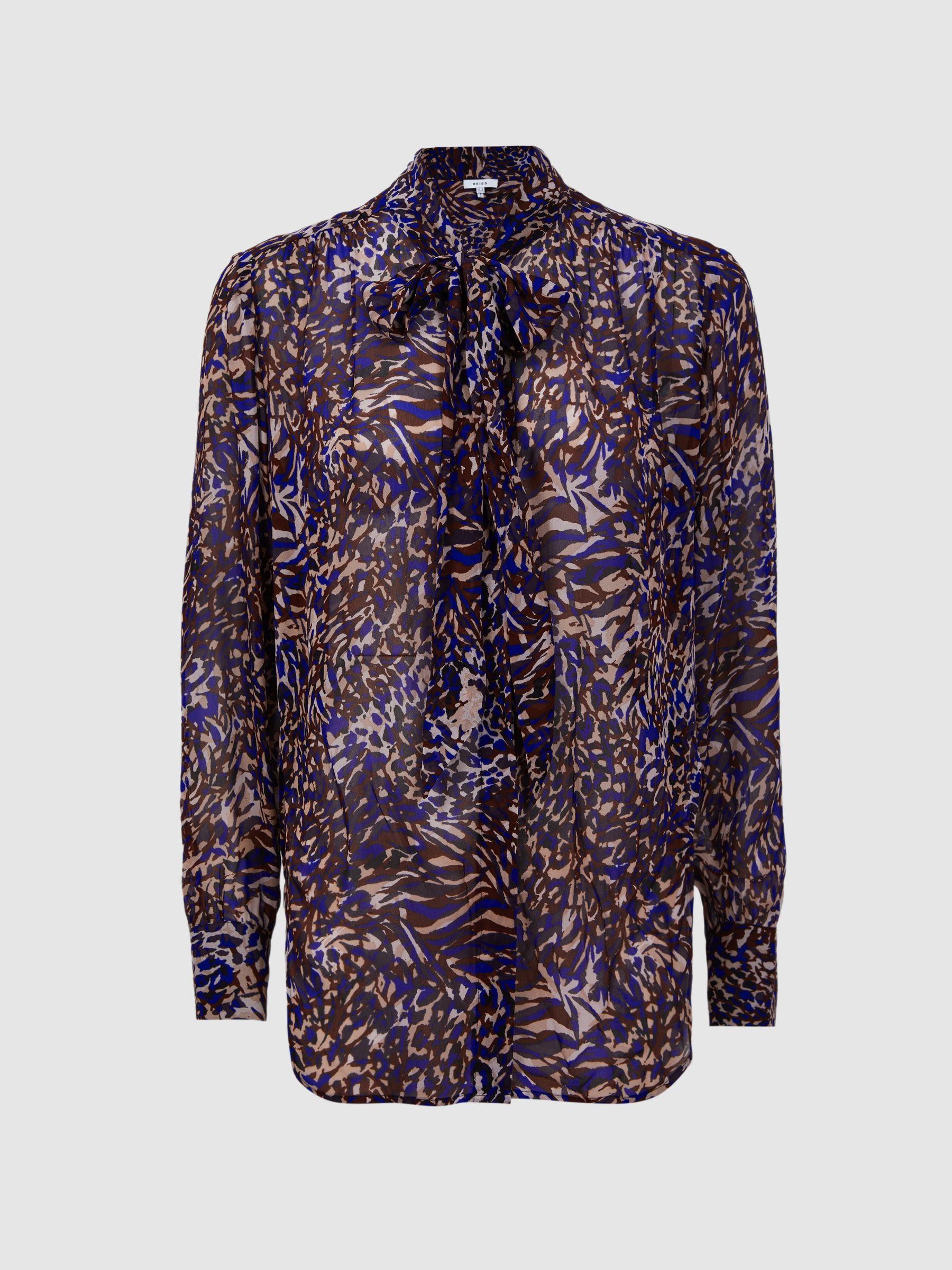 When special occasions are calling, choose the Tora as your go-to blouse. It's designed with a versatile necktie detail and side splits elevate the look. The animal print takes inspiration from 1960's styling. Wear with our tailored trousers and add heels for a bold look. Animal print Semi-sheer fabrication Self-tie neckline Button front closure Long sleeves Buttoned cuffs Side splits
