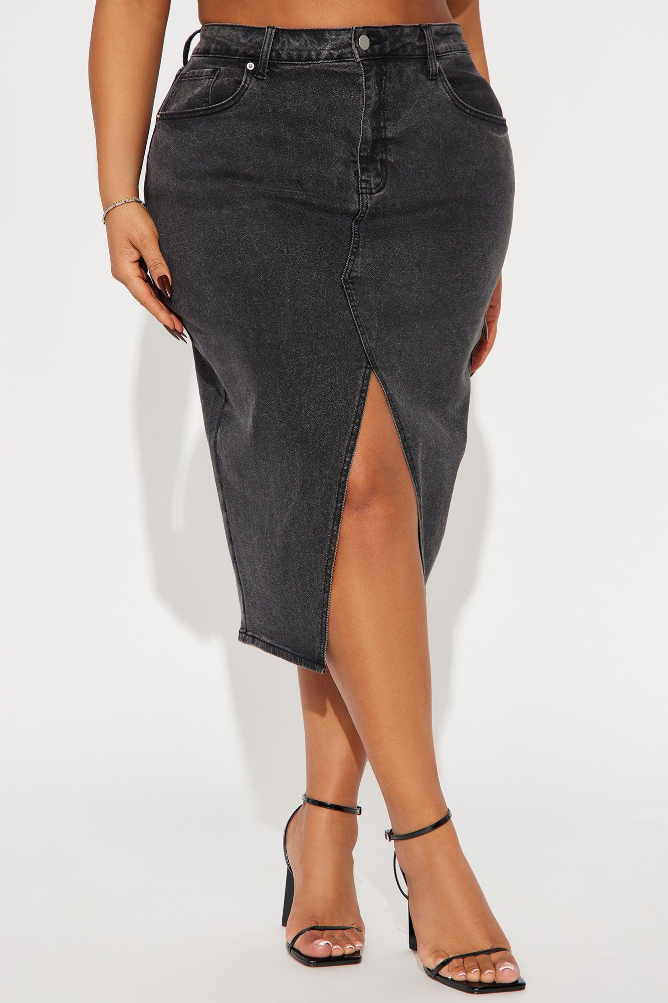 Available In Black Wash And Medium Wash. Denim Midi Skirt High Rise Button & Zip Closure Front Slit Hand & Back Pockets Stretch Self:54%Cotton 26%Polyester 18%Rayon 2%Spandex Imported California Proposition 65WARNING: Cancer and Reproductive Harm - www.P65Warnings.ca.gov.