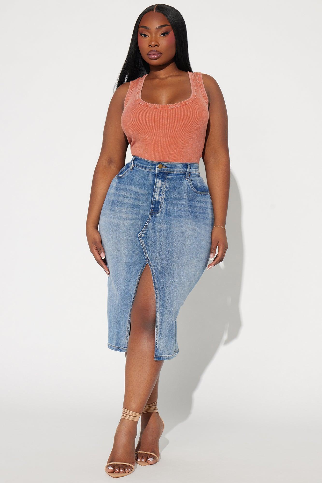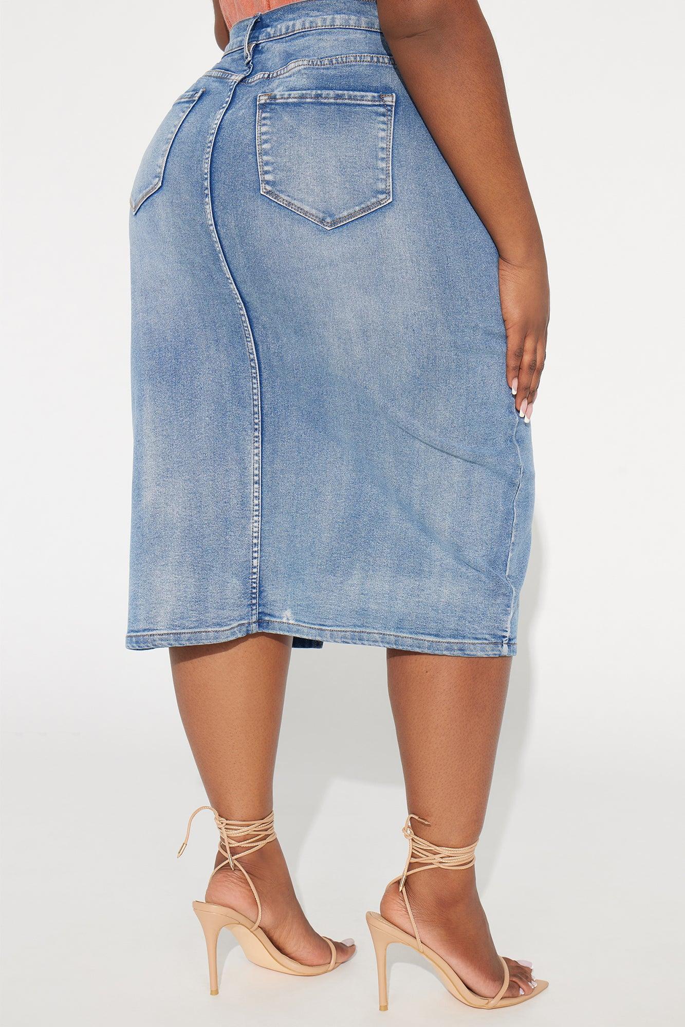 Available In Black Wash And Medium Wash. Denim Midi Skirt High Rise Button & Zip Closure Front Slit Hand & Back Pockets Stretch Disclaimer: Due To The Specialized Wash Process, Each Garment Is Unique. 54% Cotton 26% Polyester 18% Rayon 2% Spandex Imported California Proposition 65WARNING: Cancer and Reproductive Harm - www.P65Warnings.ca.gov.