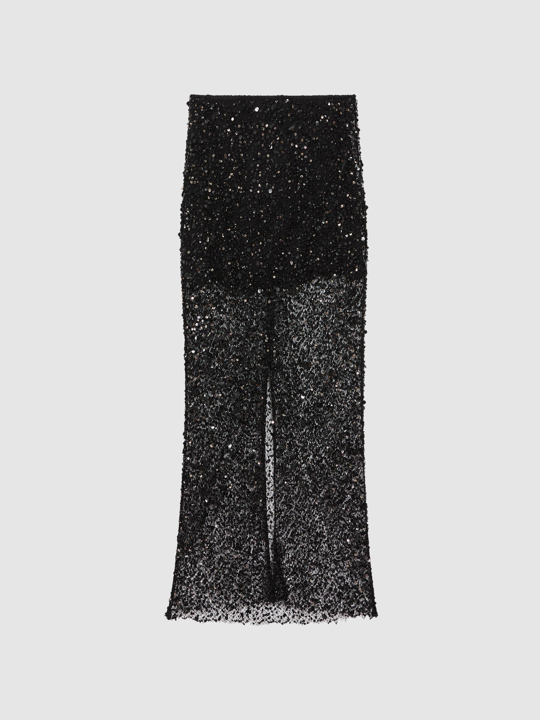 Anna Quan, curated by Reiss, is a collection of women s eveningwear borne at the intersection of minimalism and luxury. Discover these classic shapes, reimagined for a timeless style experience. Fitted with a removable mini skirt, the Irena black midi skirt is a sheer, hand-embellished netted construction. It sits high on the waist and features a back split for enhanced movement. Hand-embellished netted construction. Removable black mini skirt. High rise. Zip closure to reverse. Split to reverse. Midi length. Dry clean only.