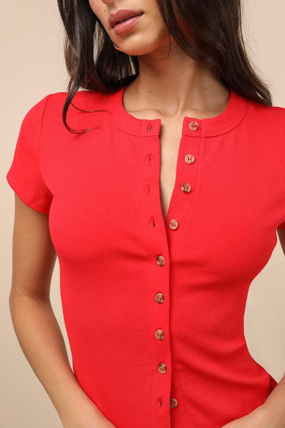 Your OOTD game just met its match with this perfect everyday top, shaped by stretchy ribbed knit for comfortable all-day wear. Short sleeves frame a classic crew neckline atop a full button placket at the center of the figure-skimming bodice, creating effortless styling options.
