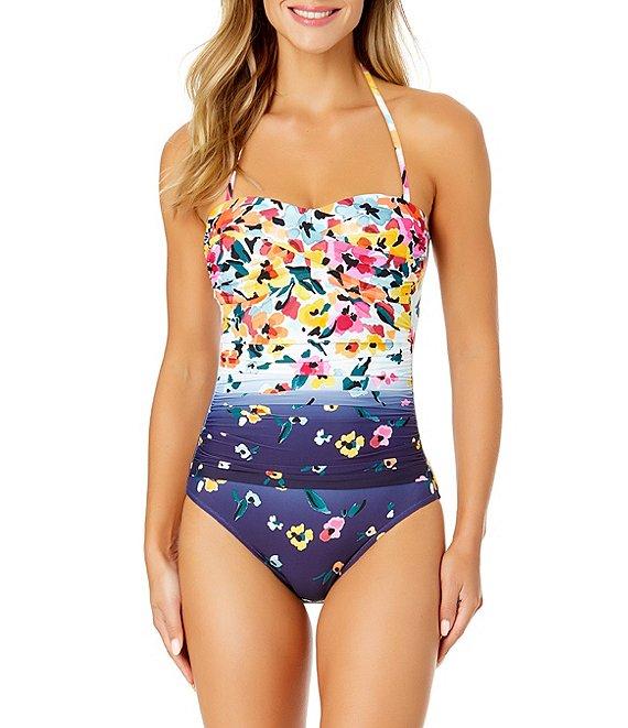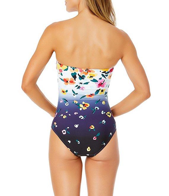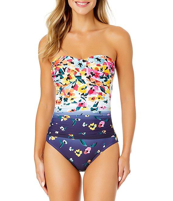 From Anne Cole, this one piece swimsuit features: Bandeau silhouette Floral print Sweetheart neckline Removable padded cups Underwire Removable adjustable straps Shirred bodice Twist front detail Moderate coverage Fully lined Pull-on construction Nylon/spandex Hand wash Imported.