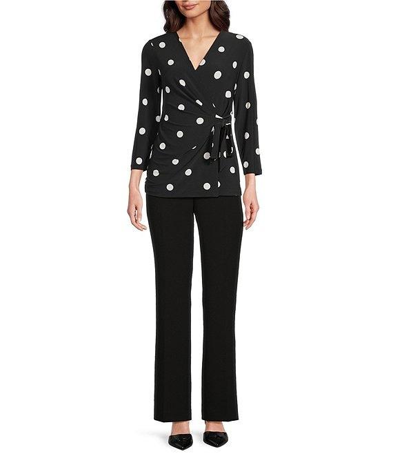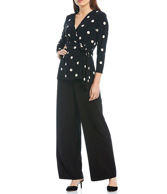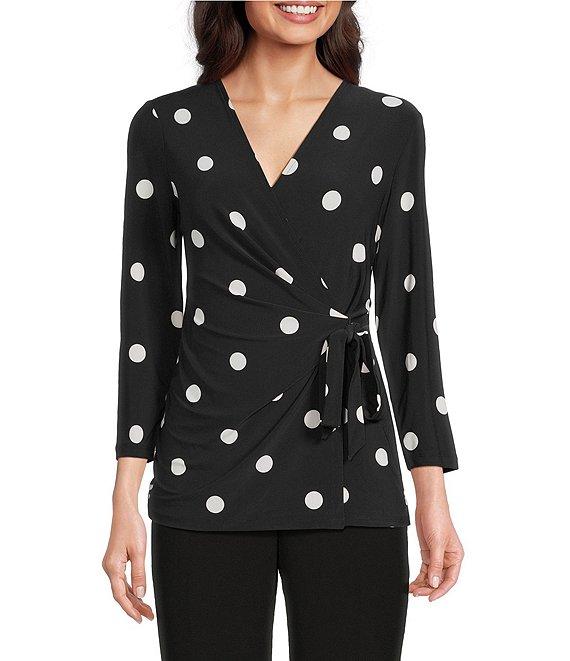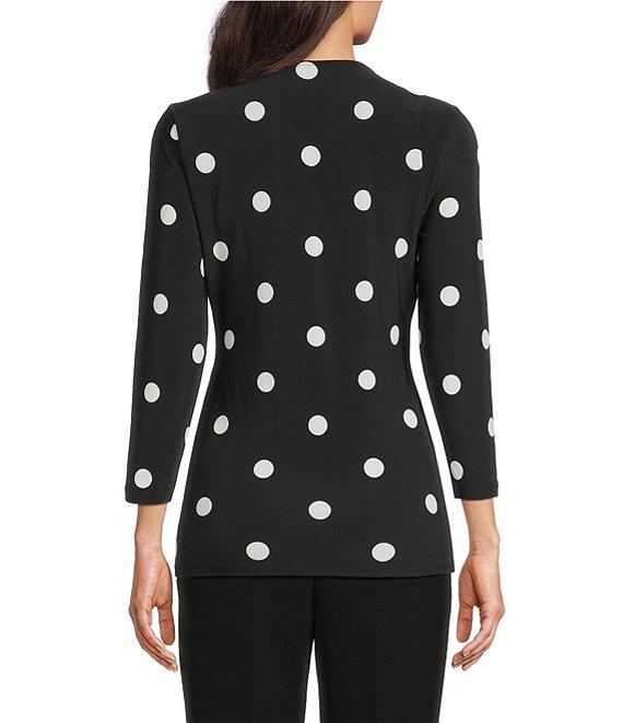 Anne Klein Knit Jersey Polka Dot Print V-Neck 3/4 Sleeve Faux-Wrap Top