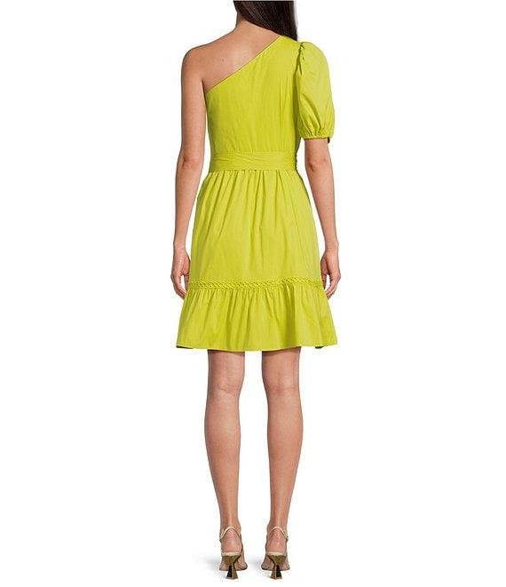 From Anne Klein, this dress features: Cotton poplin fabrication One shoulder neckline One short sleeve Fit and flare silhouette Lined Tiered skirt Belt Pockets Zip closure Approx. 38" in length Cotton/nylon/elastane Dry clean Imported.