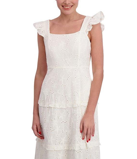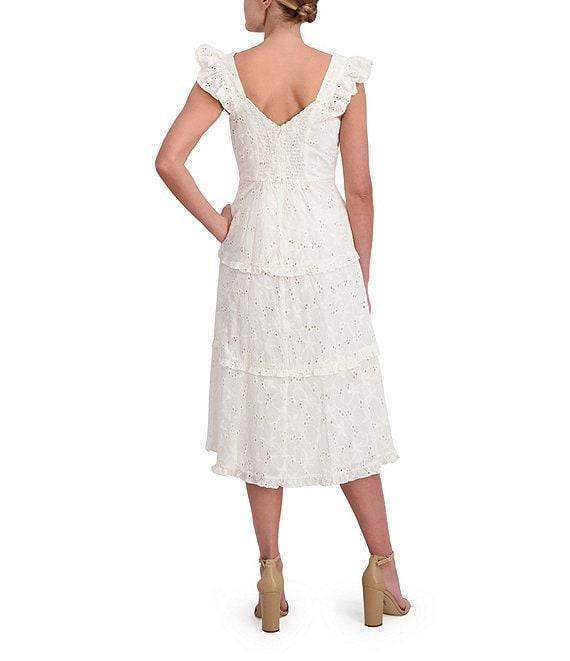 Anne Klein Scoop Neck Ruffle Shoulder Tiered Cotton Eyelet Midi Dress