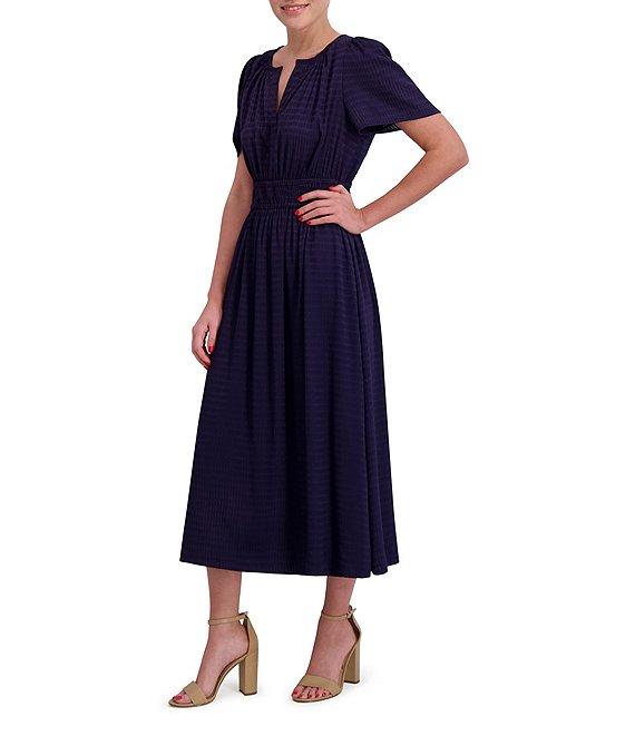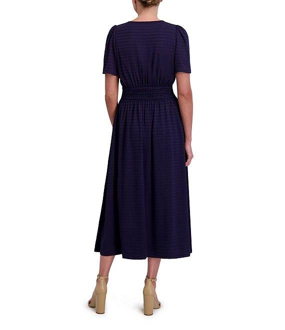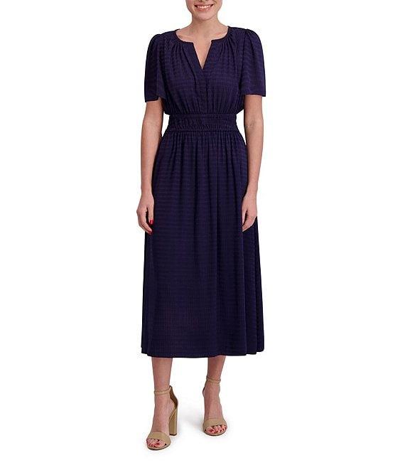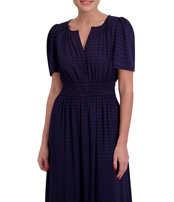 Anne Klein Split V-Neck Short Sleeve Checked Satin Smocked Waist Midi Dress