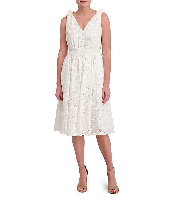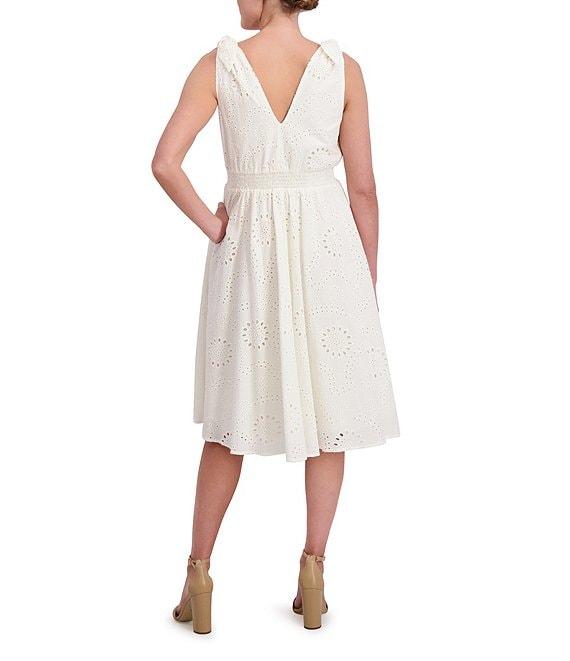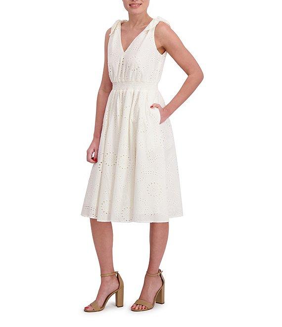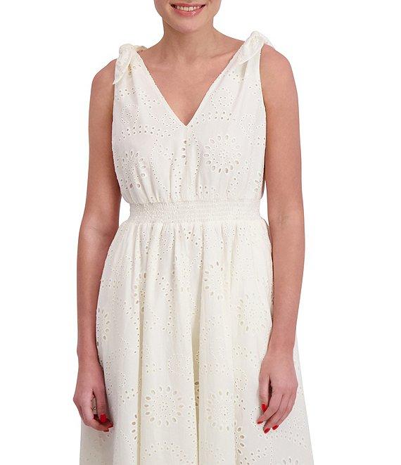 Anne Klein V-Neck Bow Shoulder Smocked Waist Cotton Eyelet Midi Dress