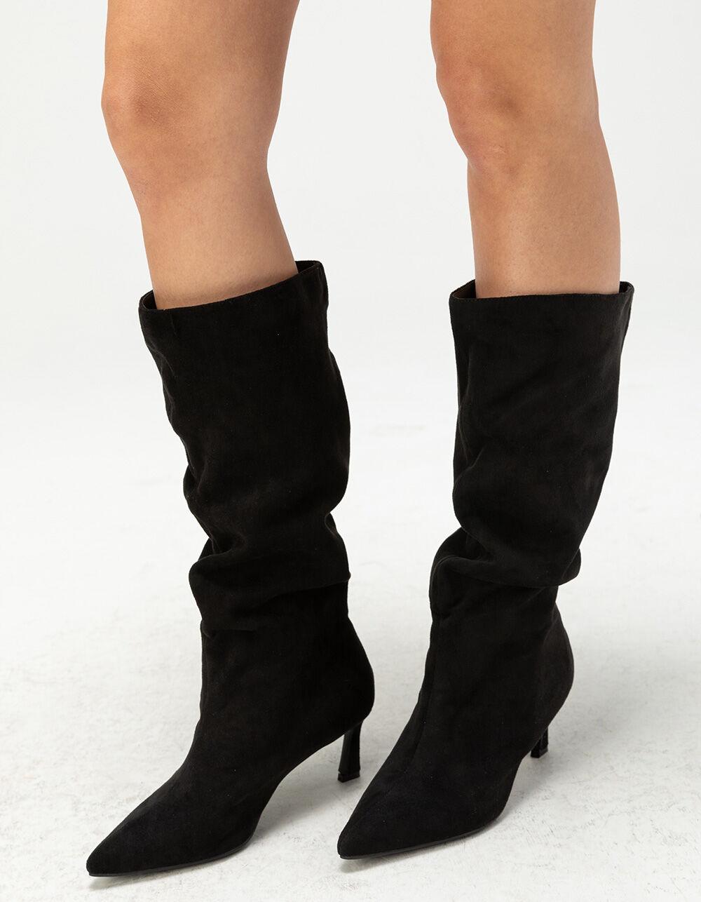 Anne Michelle Pisa Faux Suede Boots. Featuring a faux suede fabrication and a slip-on design, these boots embody style. Skinny heel. Pointed toe. Approximate heel height: 2.5". Approximate shaft height: 18". Slip-on style. Manmade upper. Synthetic outsole. Imported.