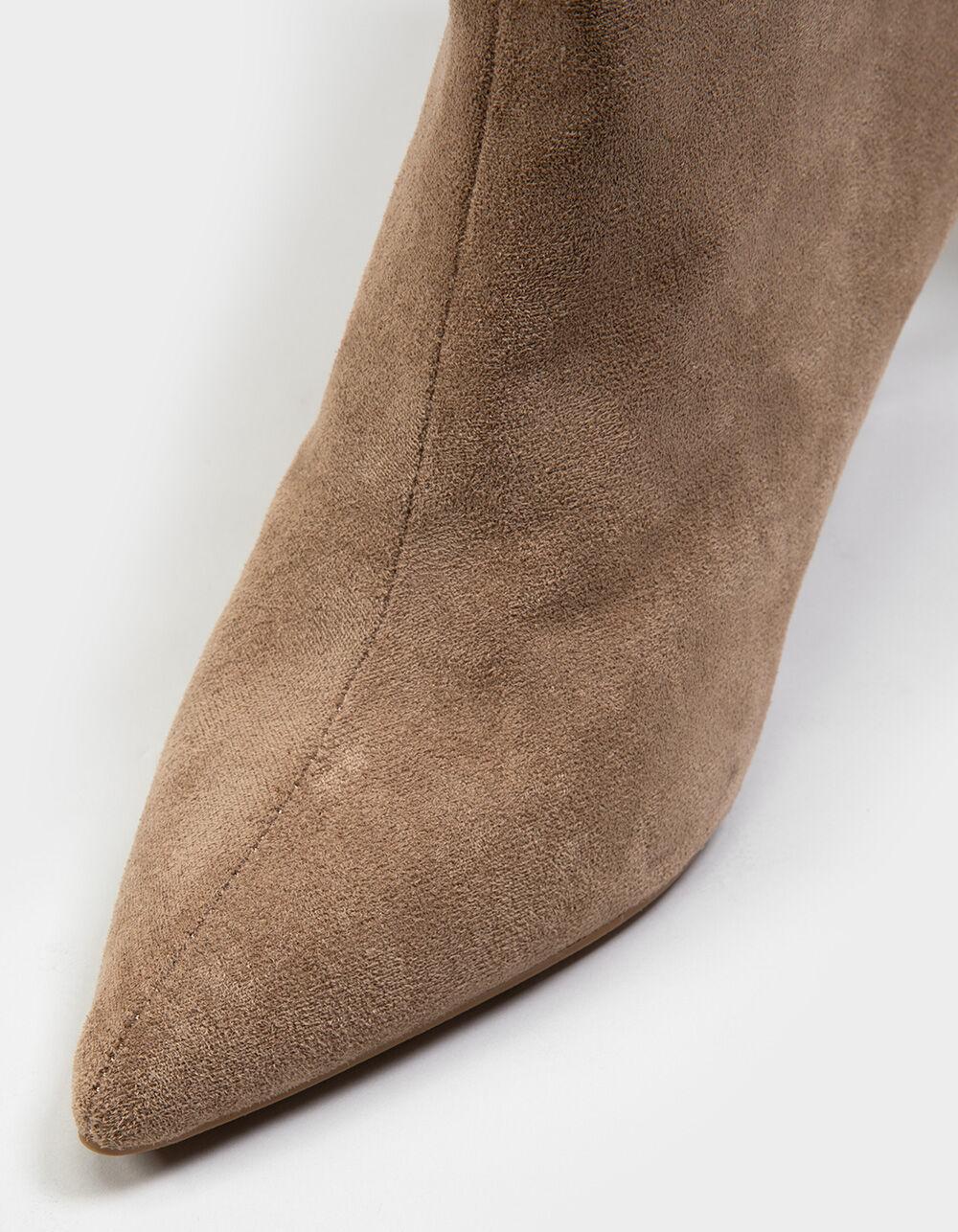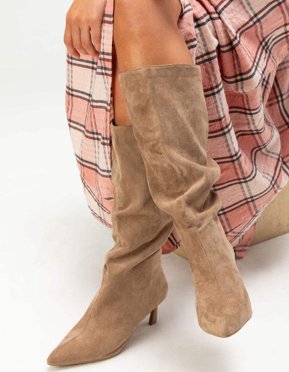 Anne Michelle Pisa Faux Suede Boots. Featuring a faux suede fabrication and a slip-on design, these boots embody style. Skinny heel. Pointed toe. Approximate heel height: 2.5". Approximate shaft height: 18". Slip-on style. Manmade upper. Synthetic outsole. Imported.