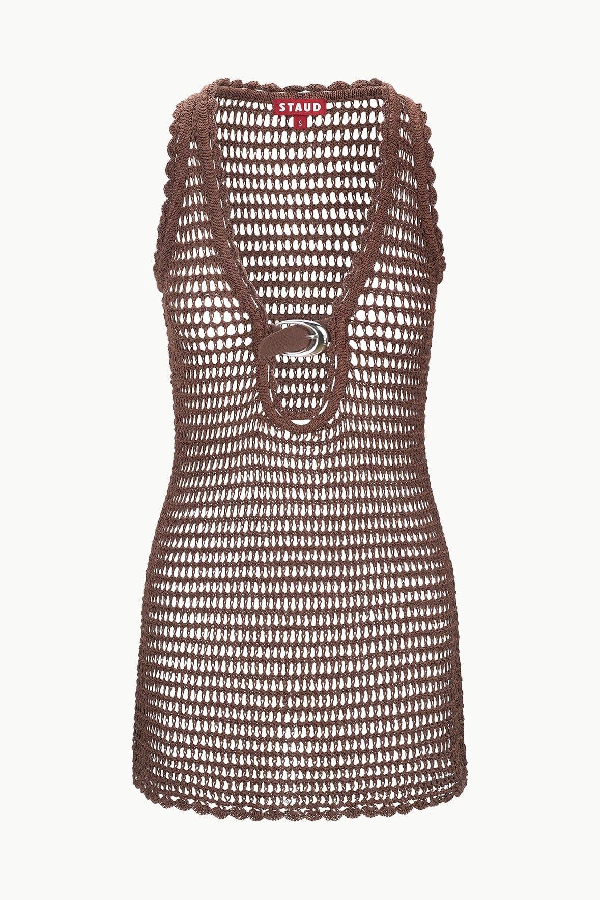 The Anok Dress is our latest crochet swim cover-up mini dress featuring our signature moon buckle hardware.
