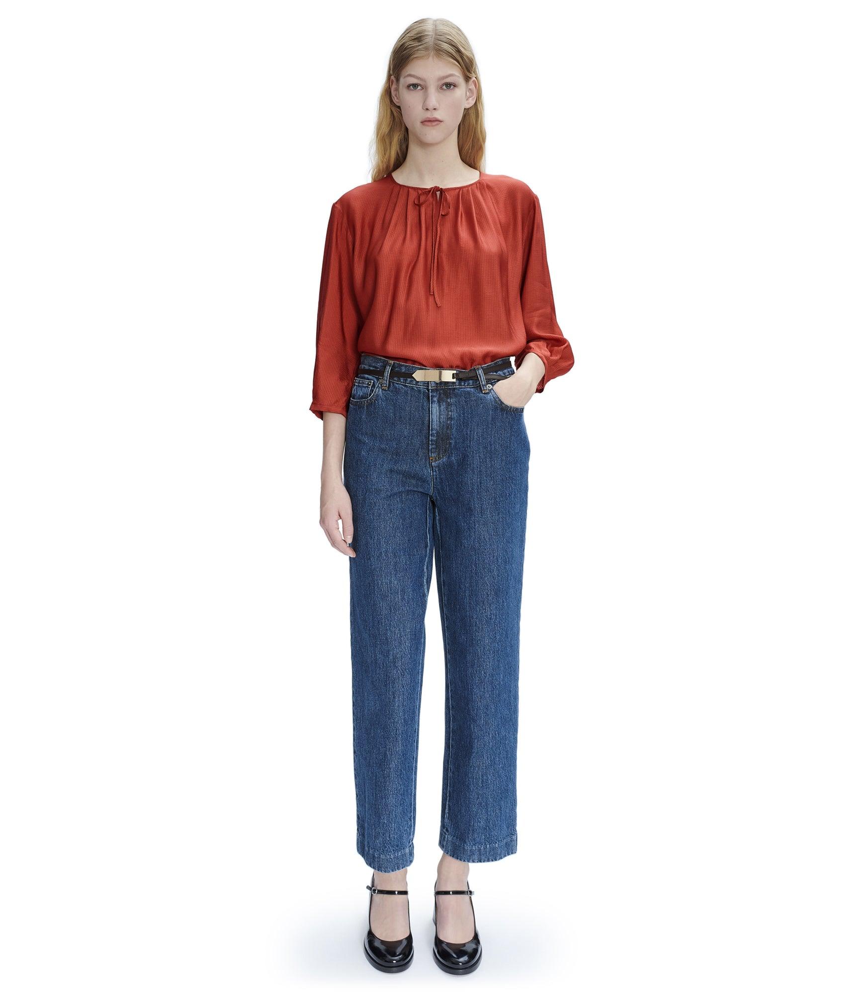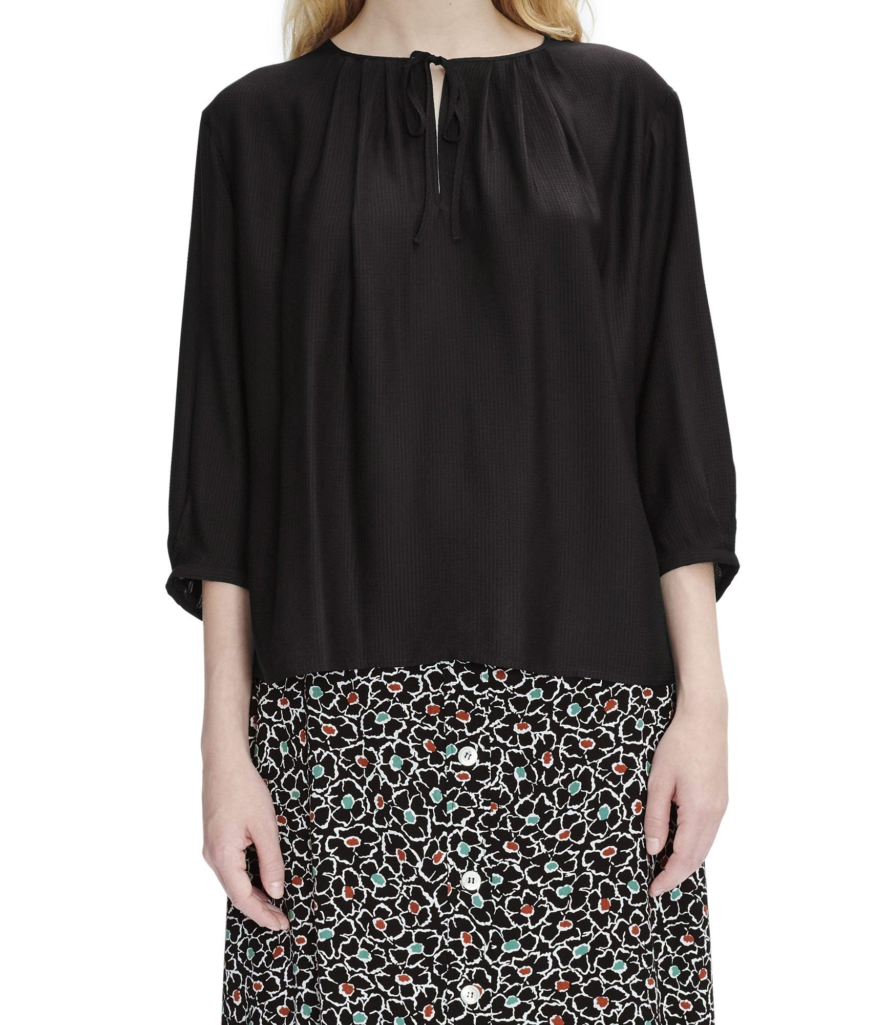 A.P.C. Women's blouse. - Fitted cut. - Keyhole collar ties with drawstrings. - Elbow-length sleeves. - Material in alternating shiny and matt stripes.