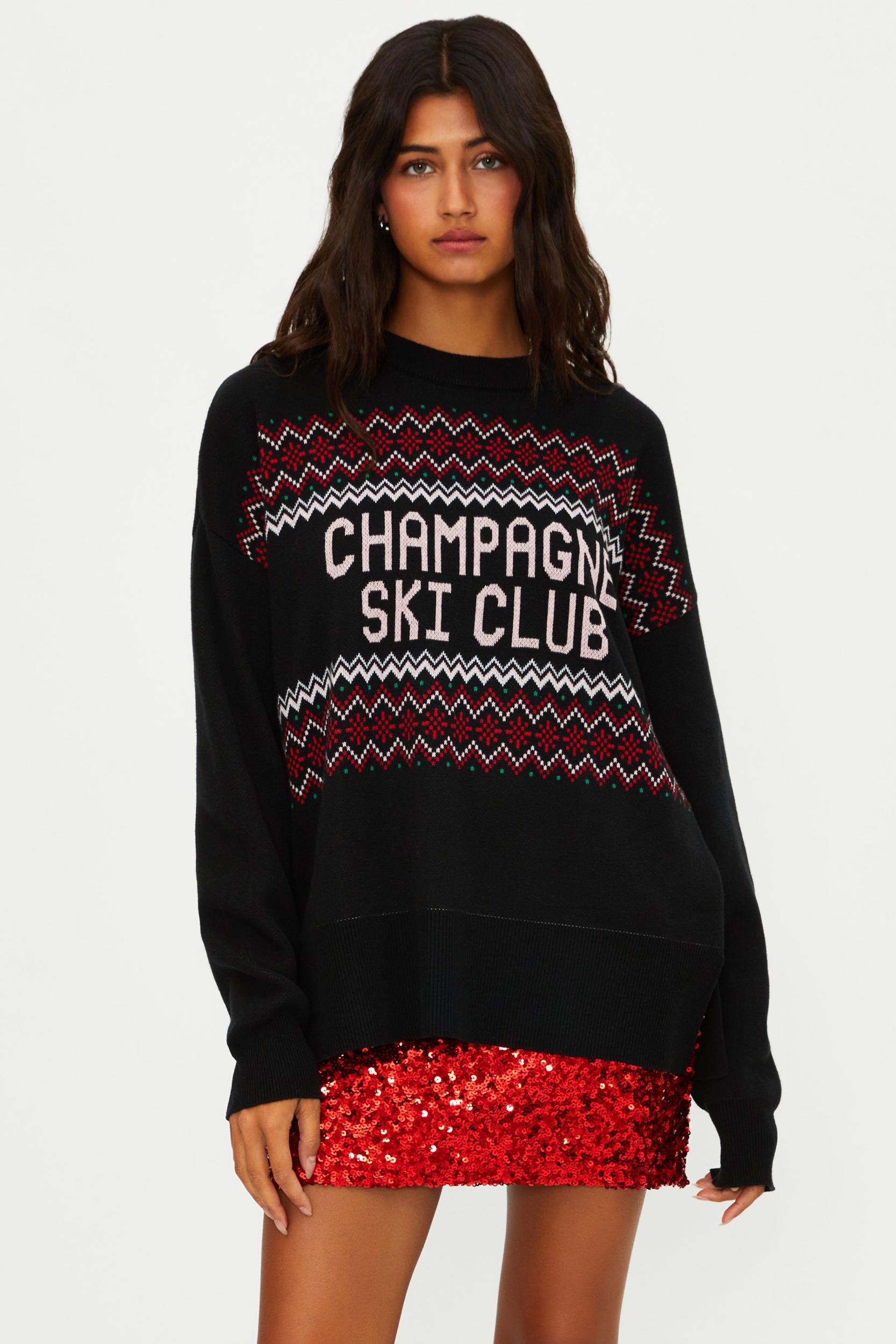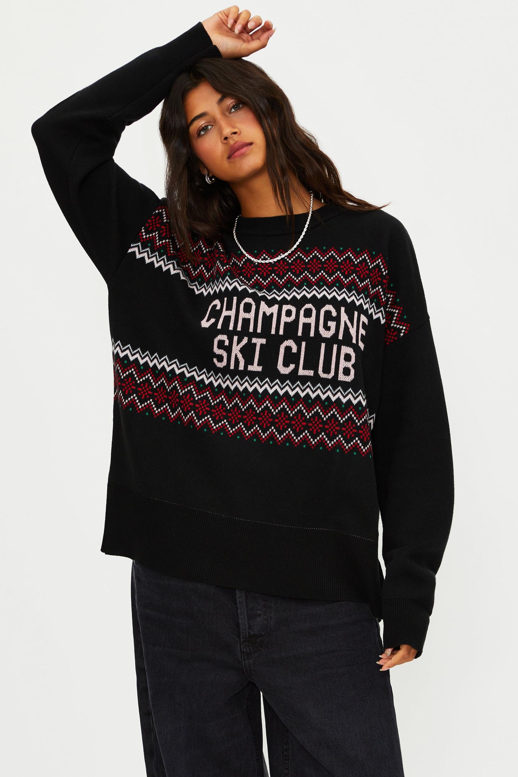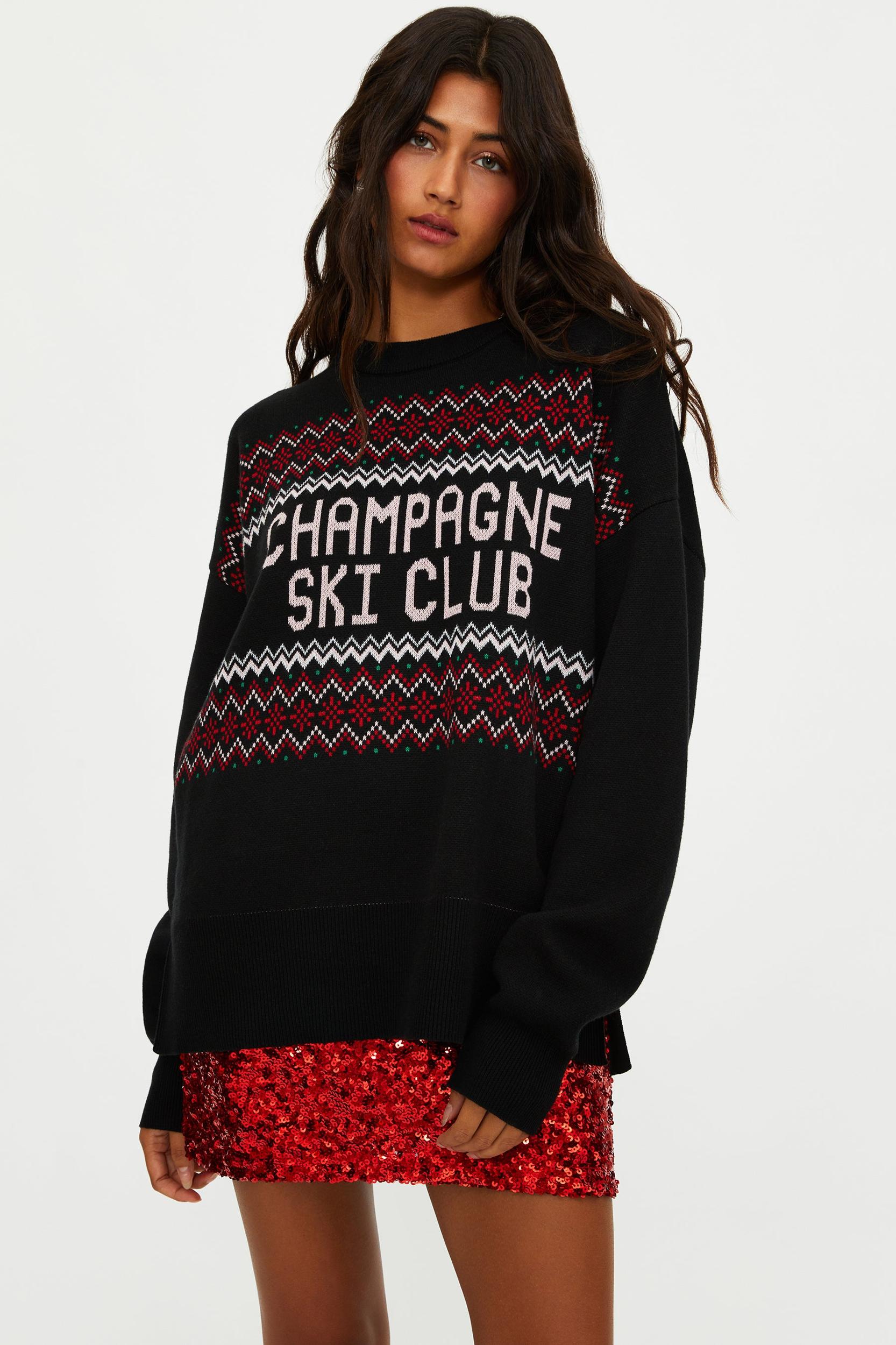 Exclusively sold at Anthropologie & Beach Riot Oversized, relaxed fit for a cozy feel Classic crew neckline with ribbed trim “Champagne Ski Club” graphic at front Festive fairisle knit pattern in holiday tones Soft, midweight knit perfect for layering Style Tip: Pair it with the Trixie Sequin Skirt for a festive statement look, or dress it down with leggings and boots for a cozy ski-lodge vibe Model is wearing size small