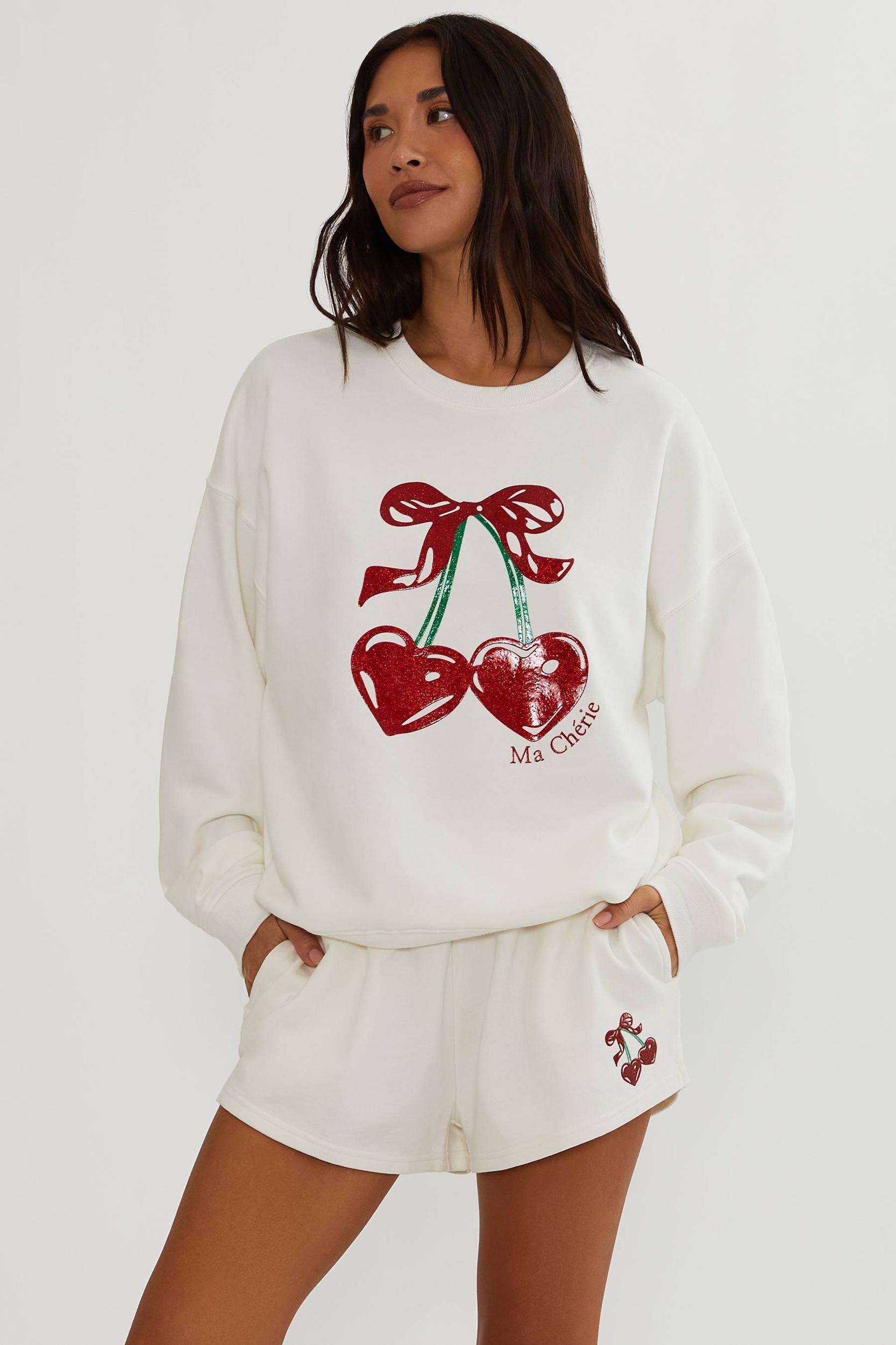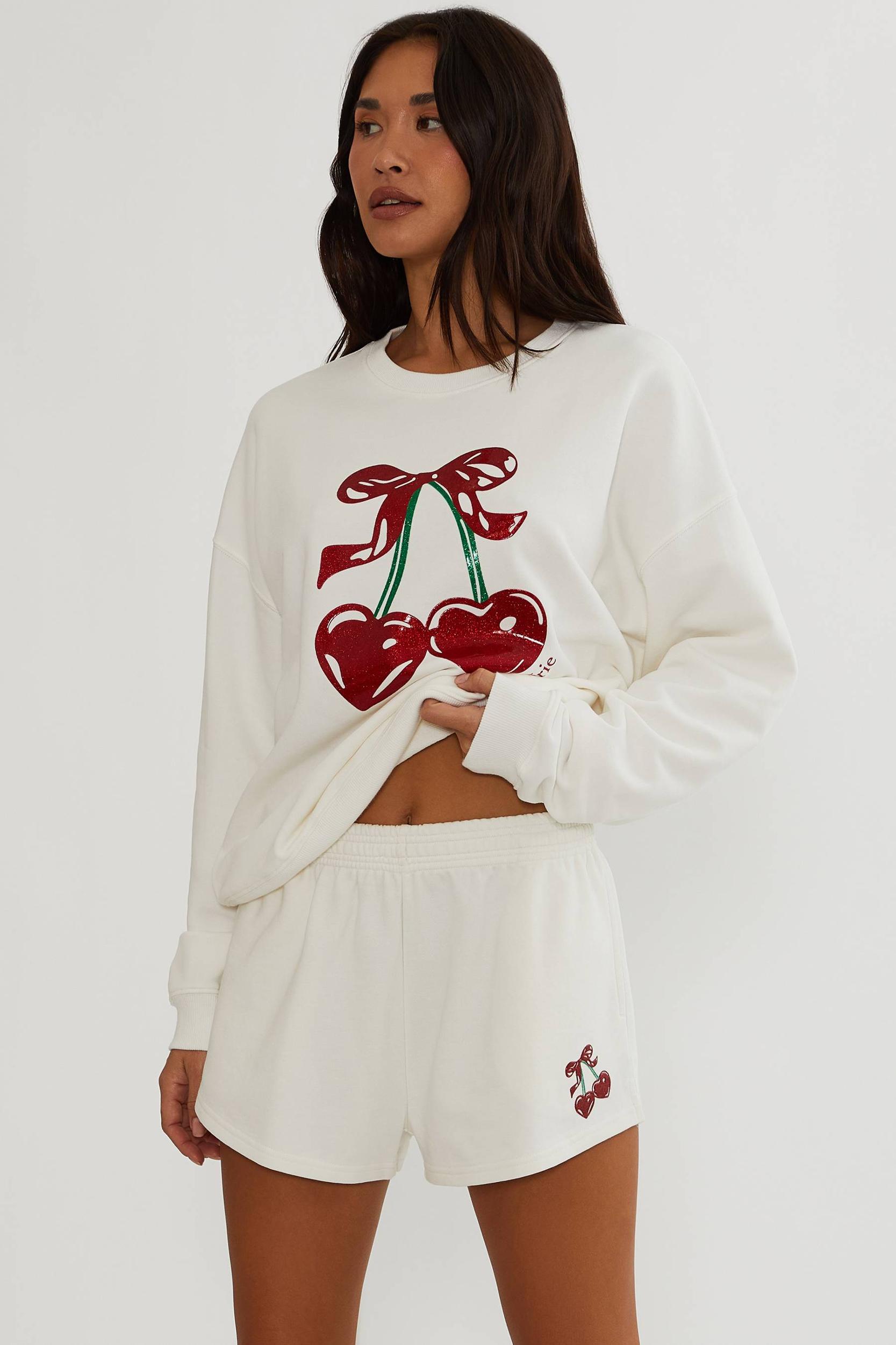 Ultra-soft cotton fleece Relaxed, easy fit that still looks polished Statement cherry graphic with glossy detail for a pop of personality Lightweight yet cozy—perfect for layering year-round Style Tip: Pair it with the matching Malik shorts for a head-to-toe lounge moment with sneakers for an effortless, cool-girl weekend look. Model is wearing size small