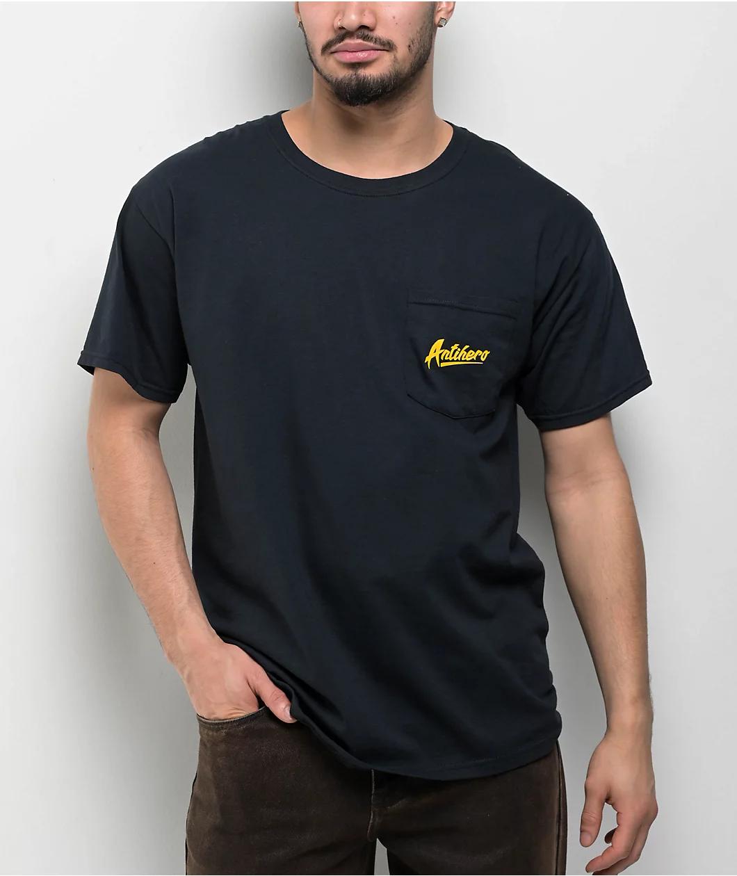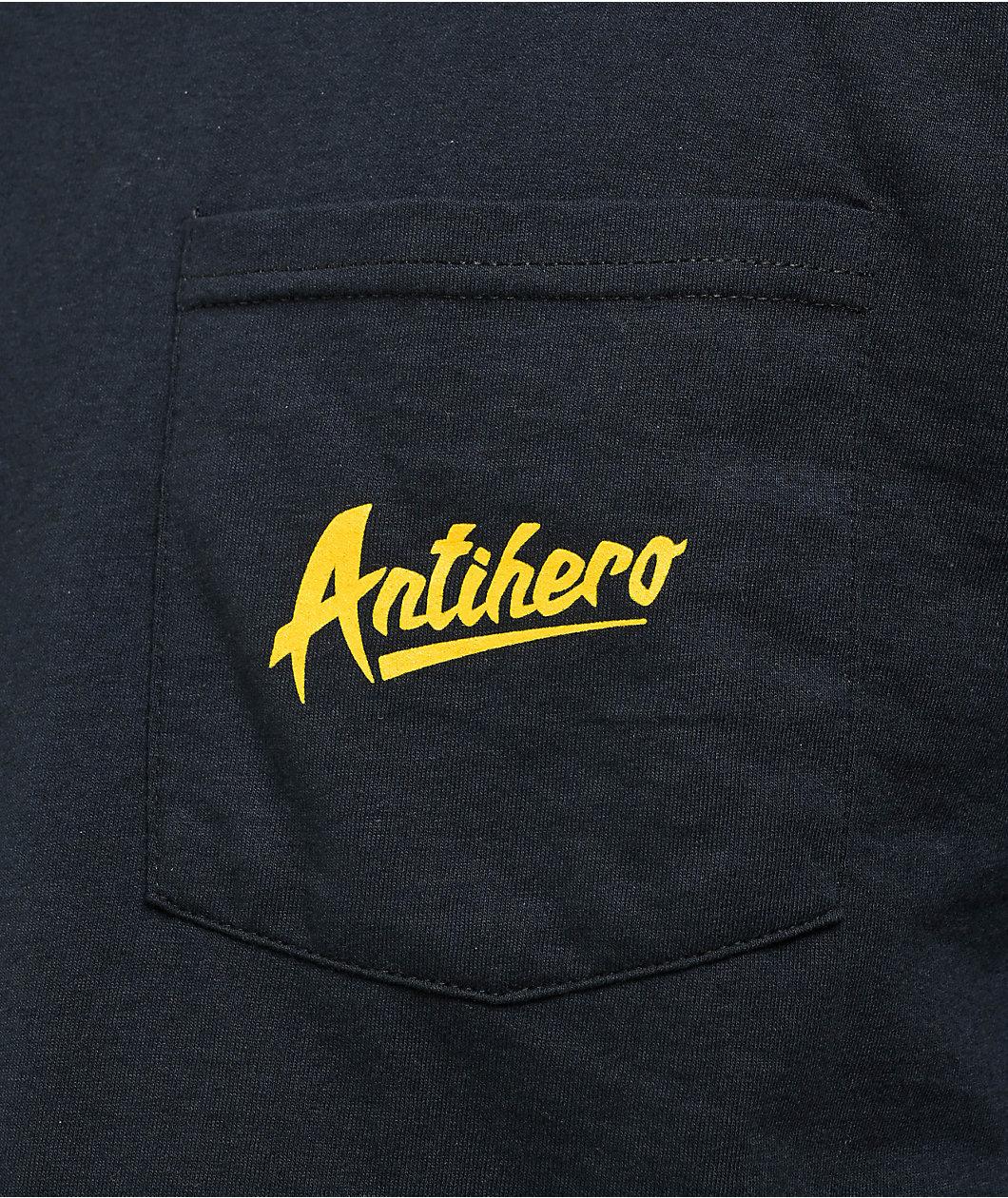 The minds at Anti-Hero present the Refrescos t-shirt in black. Brilliant gold branding script adorns a patch pocket on the left chest, with additional branding on the back depicting a bird alongside English and Spanish text. With a no-itch printed ne