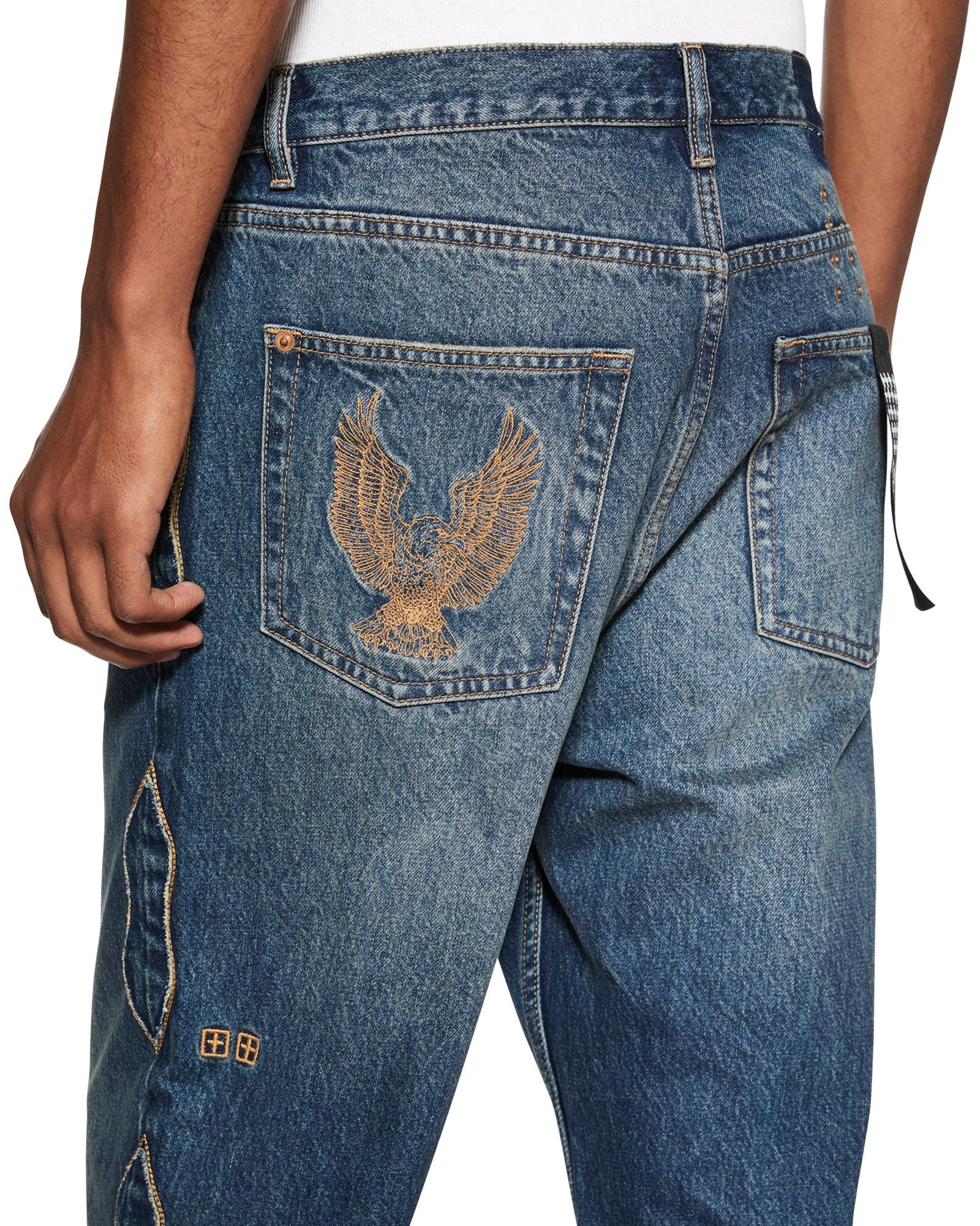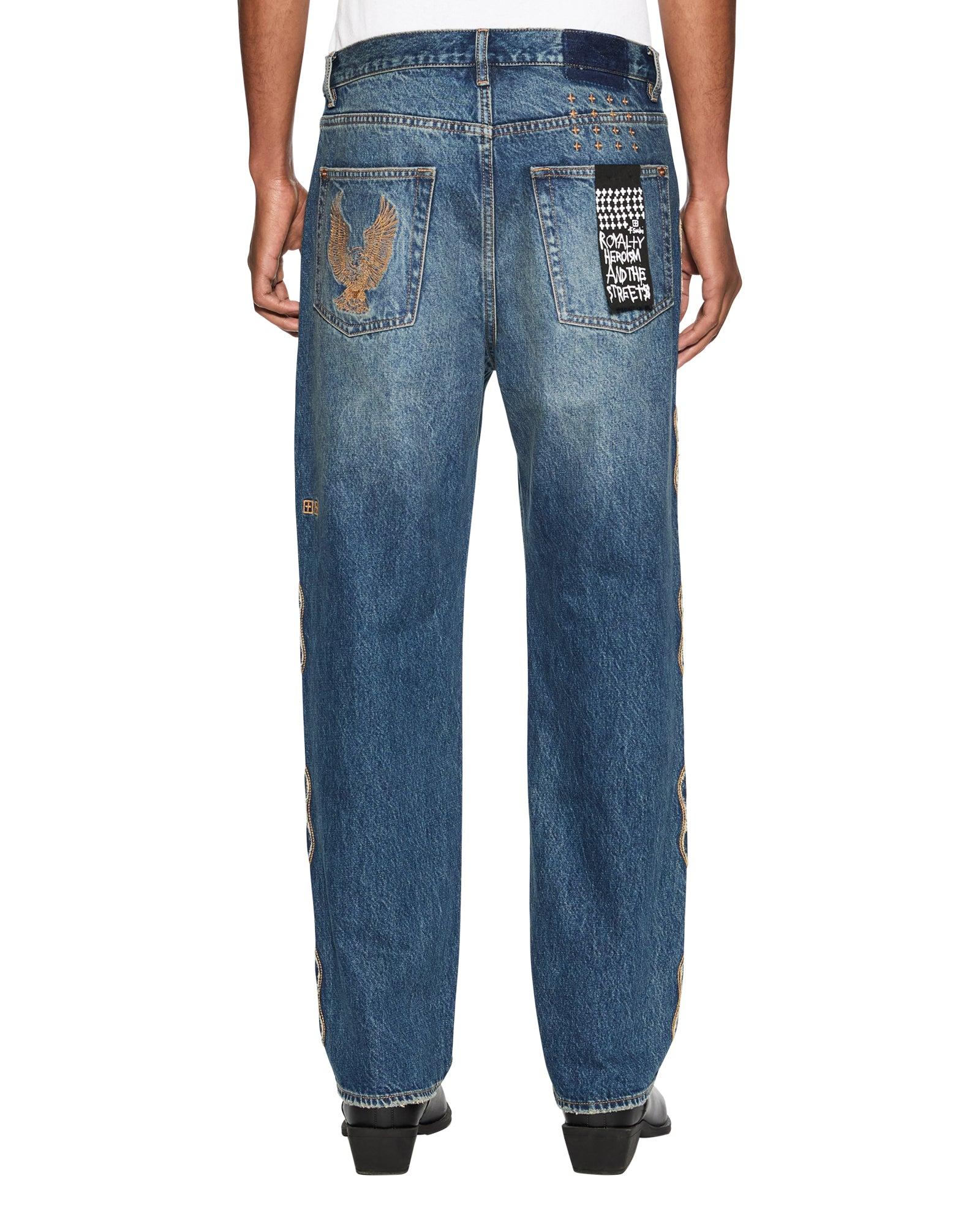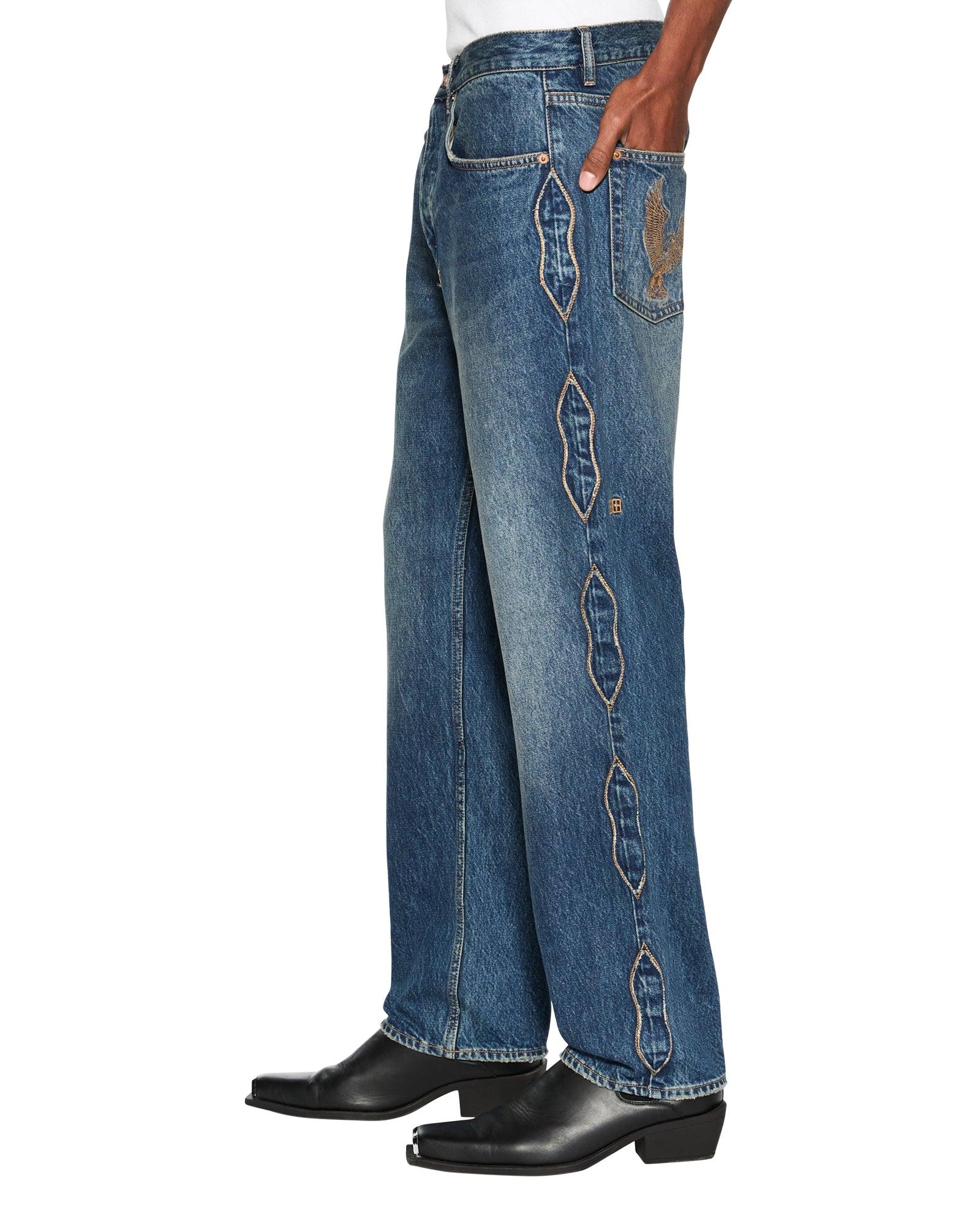 The Anti K Antique Kraft is a mid-rise, relaxed fit jean with a wide straight leg. Crafted from premium rigid denim in a dark indigo wash, featuring raw cut side seam applique details and back pocket eagle embroidery. Finished with tobacco coloured top stitching.