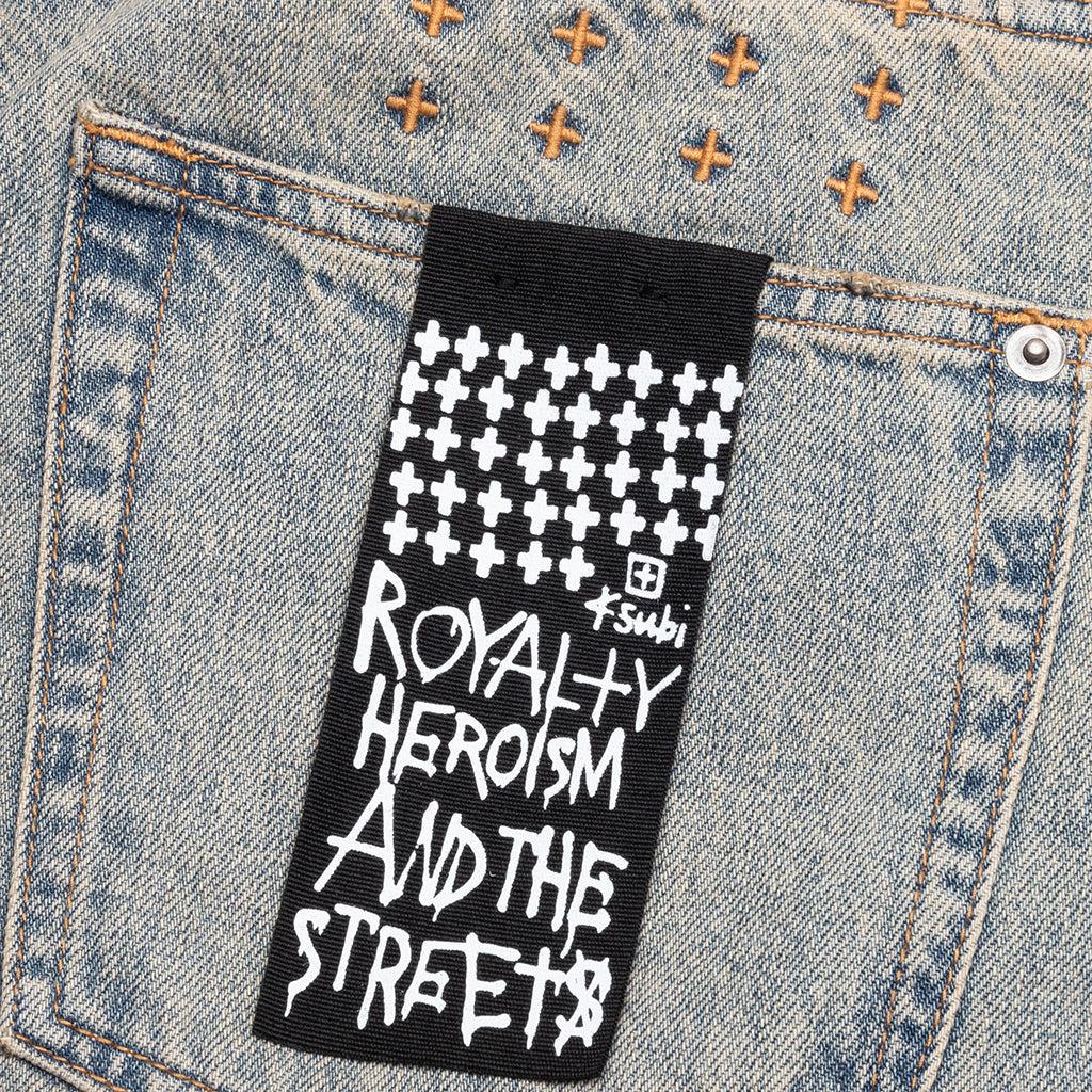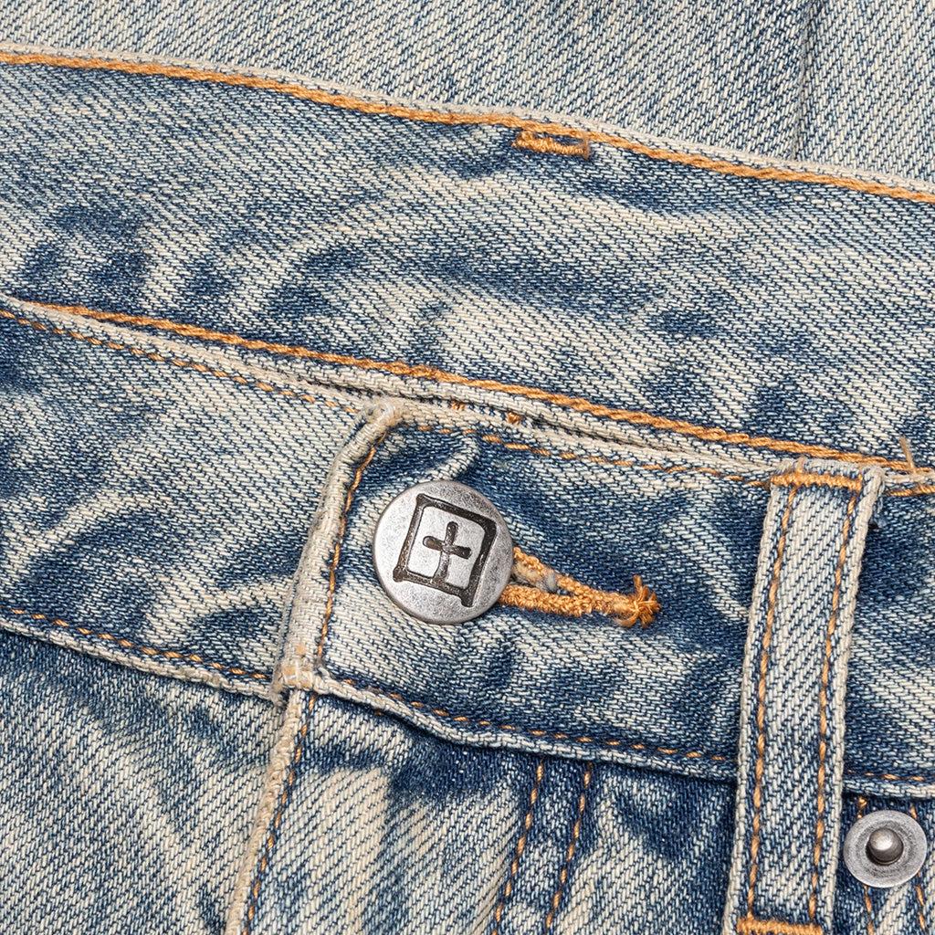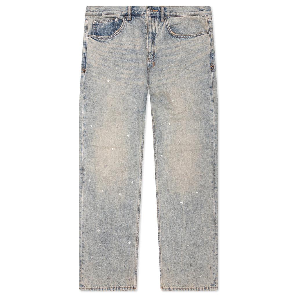The Ksubi Anti K Stagelight Metalik Pants are mid-rise and straight-leg jeans with a relaxed fit, cut from premium rigid denim and treated with a vintage-tinted stone wash. Featuring metal plus hotfix detailing concentrated at the hem and fading toward the waist, this style is finished with ghost patching, Ksubi’s signature T-box and 4x4 embroidery, and branded hardware. 100% Cotton Straight leg fit Mid rise Five-pocket construction Vintage-tinted stone wash Metal plus hotfix detailing Ghost patching accents Ksubi T-box branding Back 4x4 cross embroidery Signature woven pocket tag Branded hardware Style No: MSP25DJ051-098