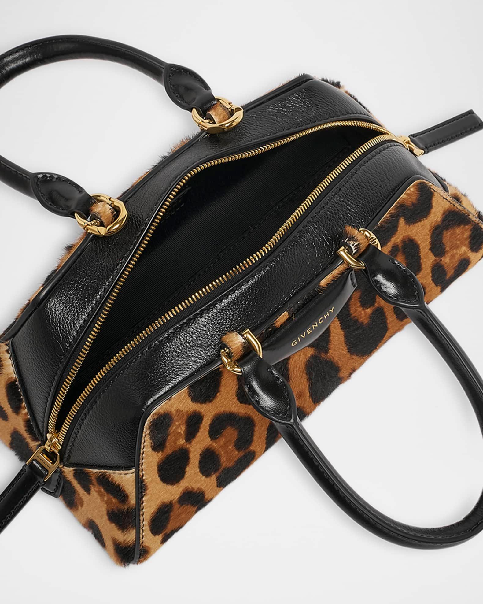 This Givenchy "Antigona" slim east-west mini top handle bag is made in shiny buffalo leather and leopard-printed natural/dyed calf hair (Italy) Rolled top handles Two-way zip top closure Lining: Viscose Approx. 4.3"H x 9.4"W x 4.3"D Made in Italy