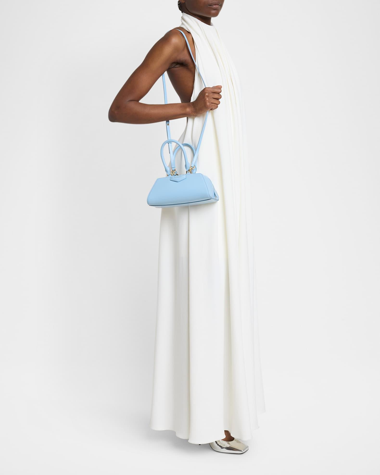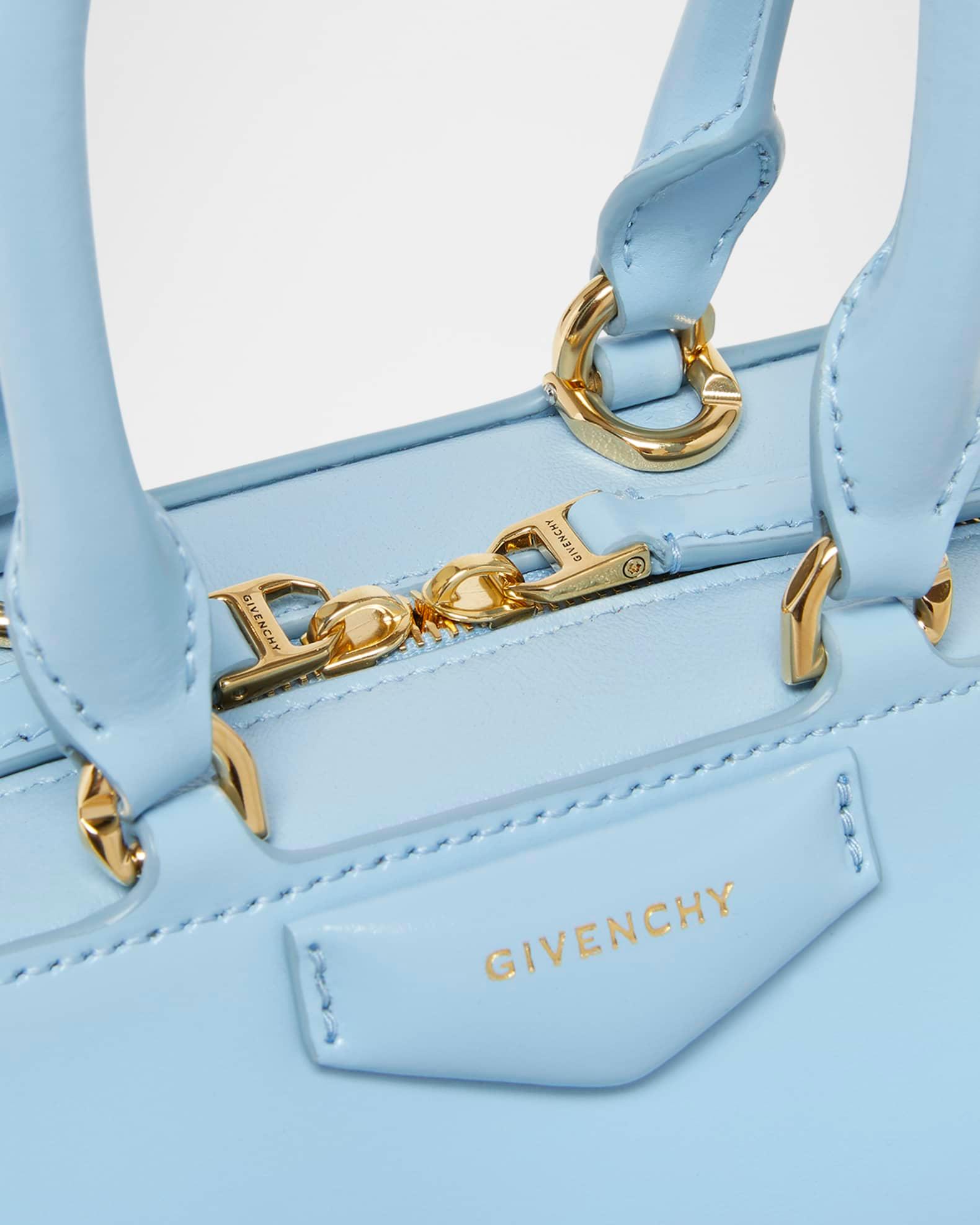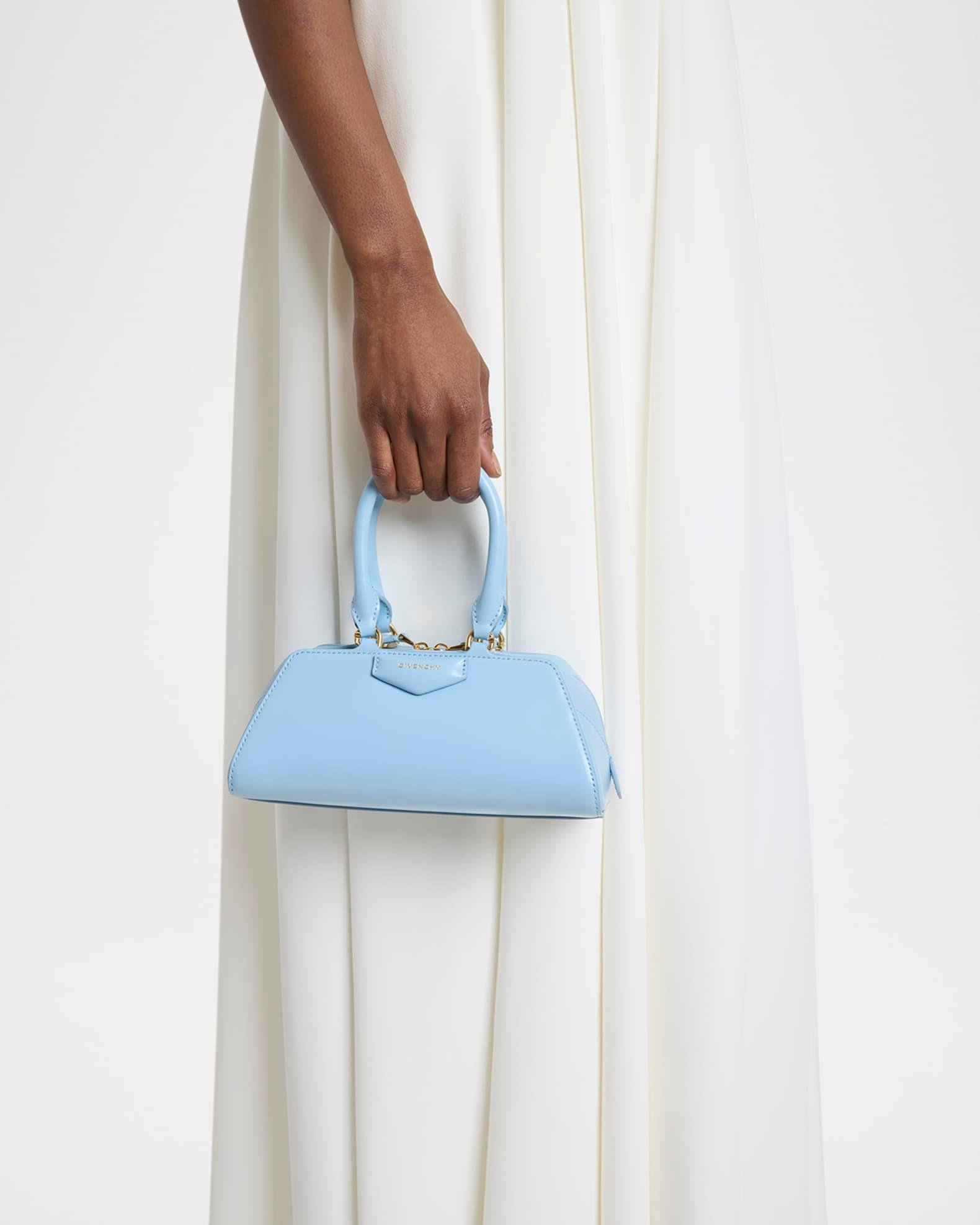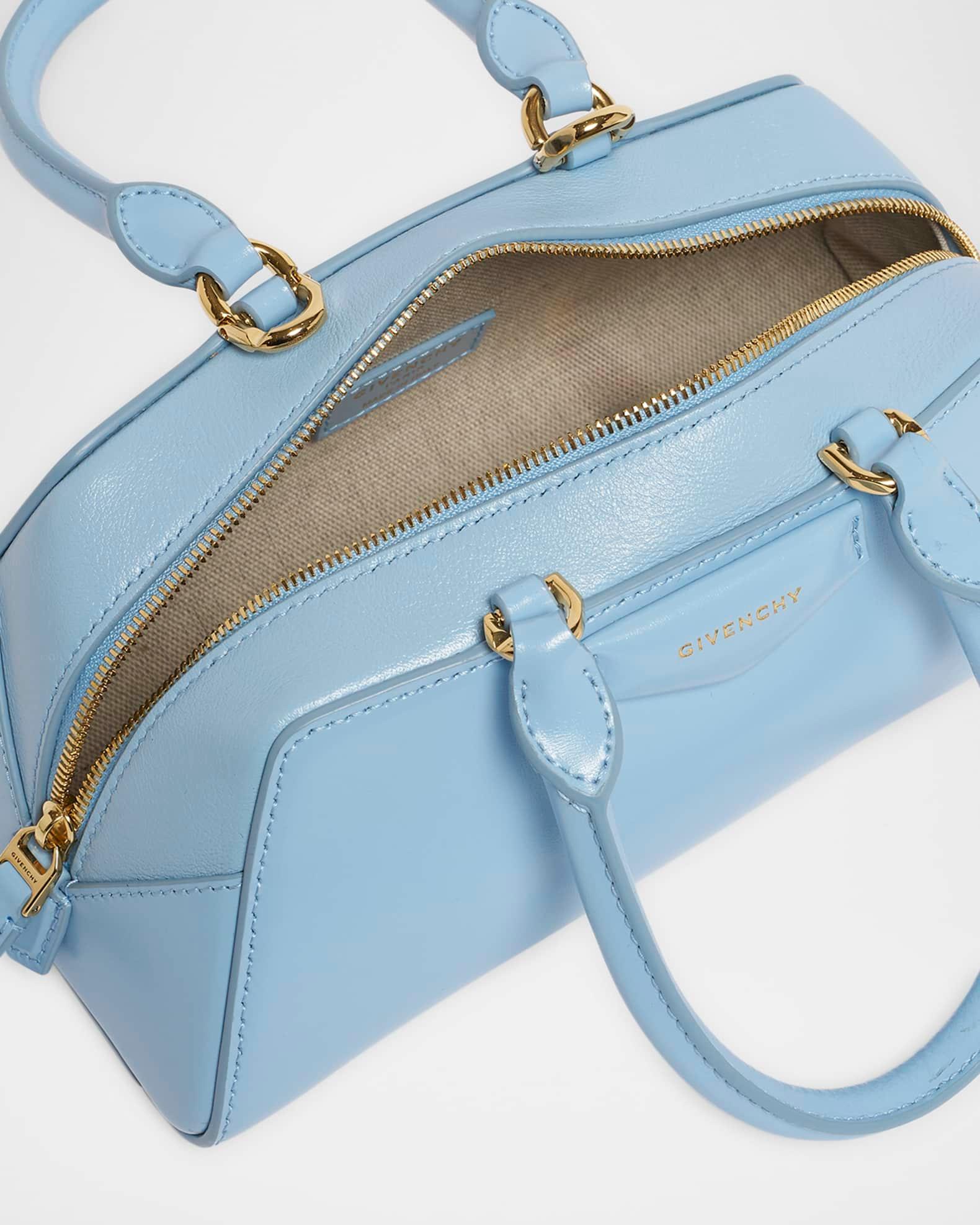 The "Antigona" top-handle bag from Givenchy features a modern, east-west geometric design with its clean lines and fine hardware finishes Crafted in smooth and shiny box leather Rolled top handles Detachable, adjustable crossbody strap, 23.2" drop Two-way zip top Lining: Cotton Approx. 4.3"H x 9.5"W x 4.3"D Made in Italy