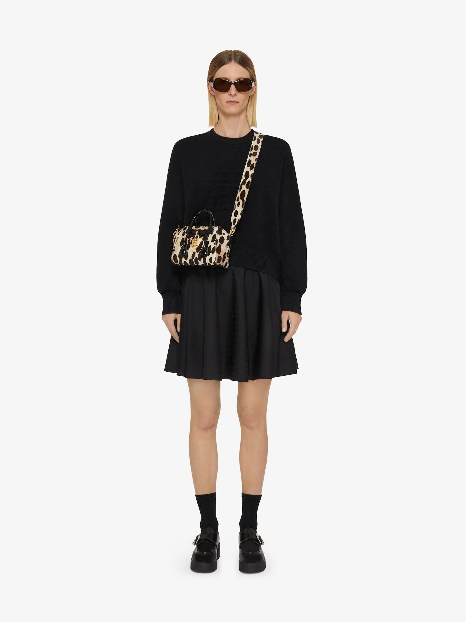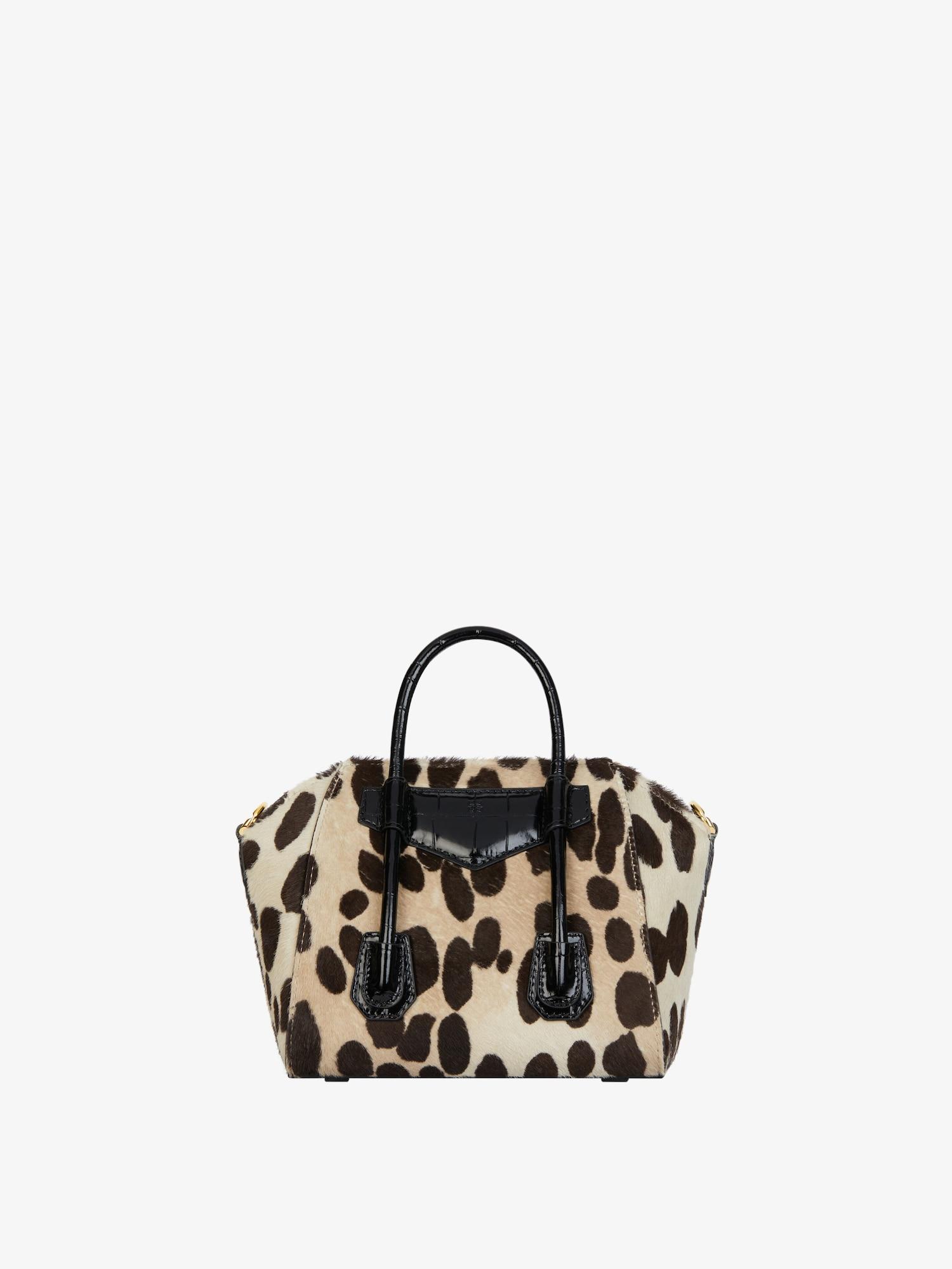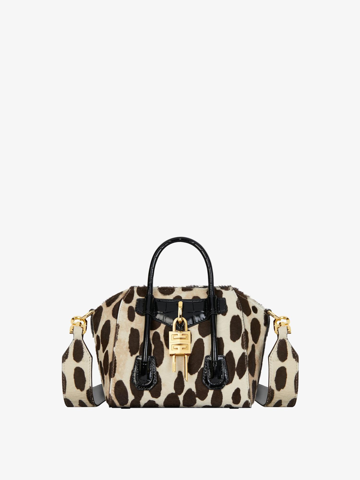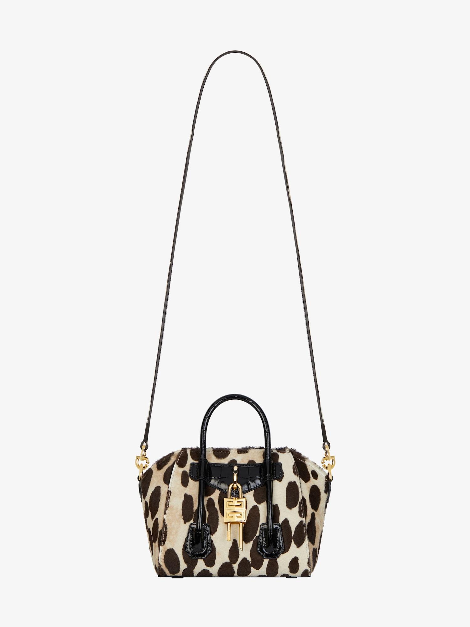 Mini handbag or crossbody bag in pony calfskin leather. Antigona Toy line. Leopard print. Magnetic closure. Leather handles. Large removable shoulder strap in matching leather with GIVENCHY signature on the top. Pentagonal patch with removable 4G padlock on the front. Pentagonal patch with debossed 4G emblem on the back. Golden-finish metal details. One main compartment and one flat pocket inside.