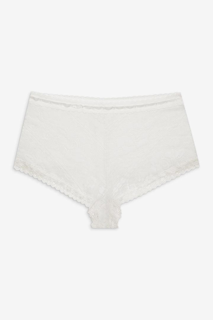 Become a vintage Muse in the Antique white lace shorts—sheer shorts with a cheeky back fit crafted in antique-inspired floral lace and adorned with scallop lace trims and a functional slotted ribbon lace trim at waist with a functional ribbon tie.