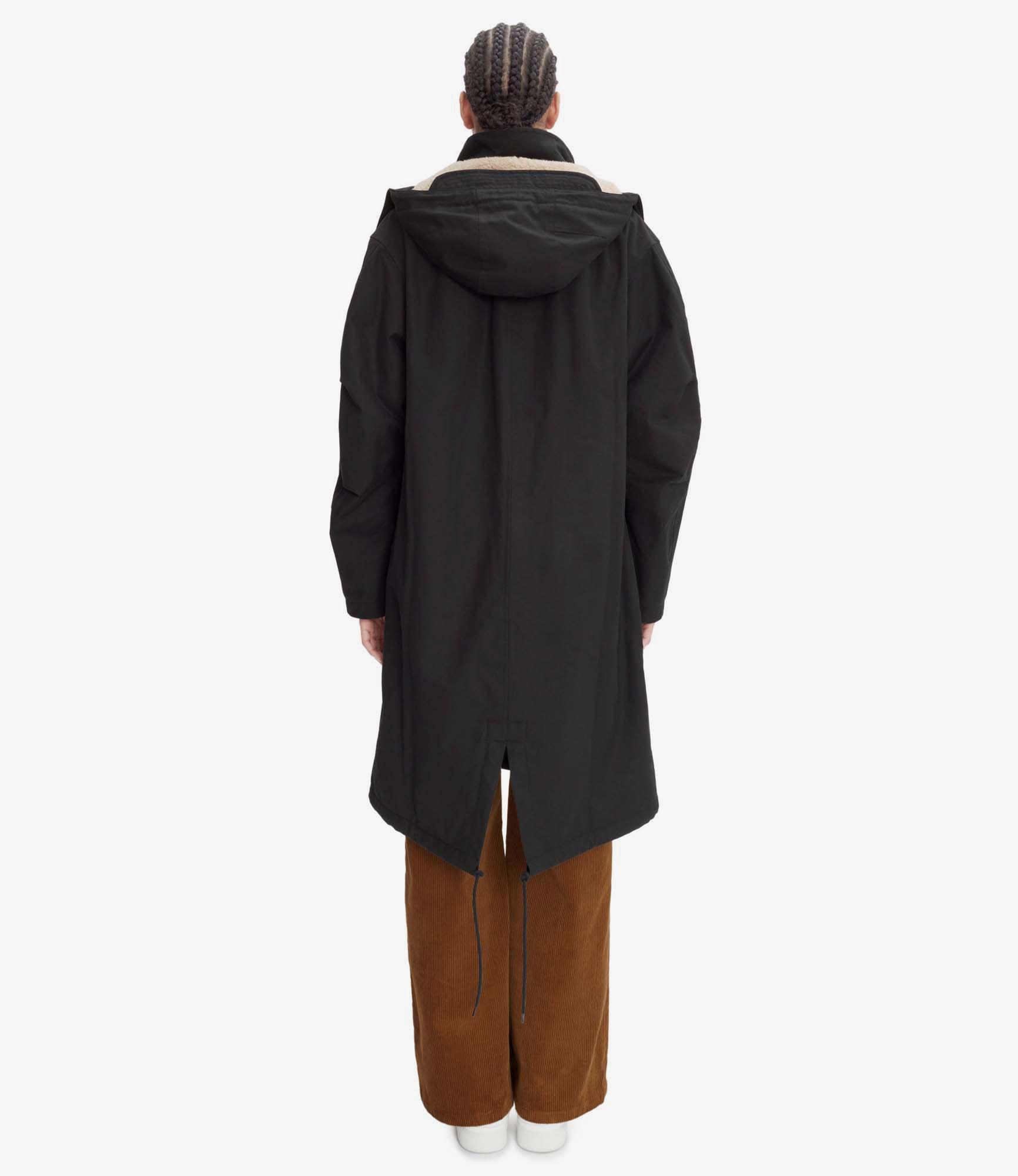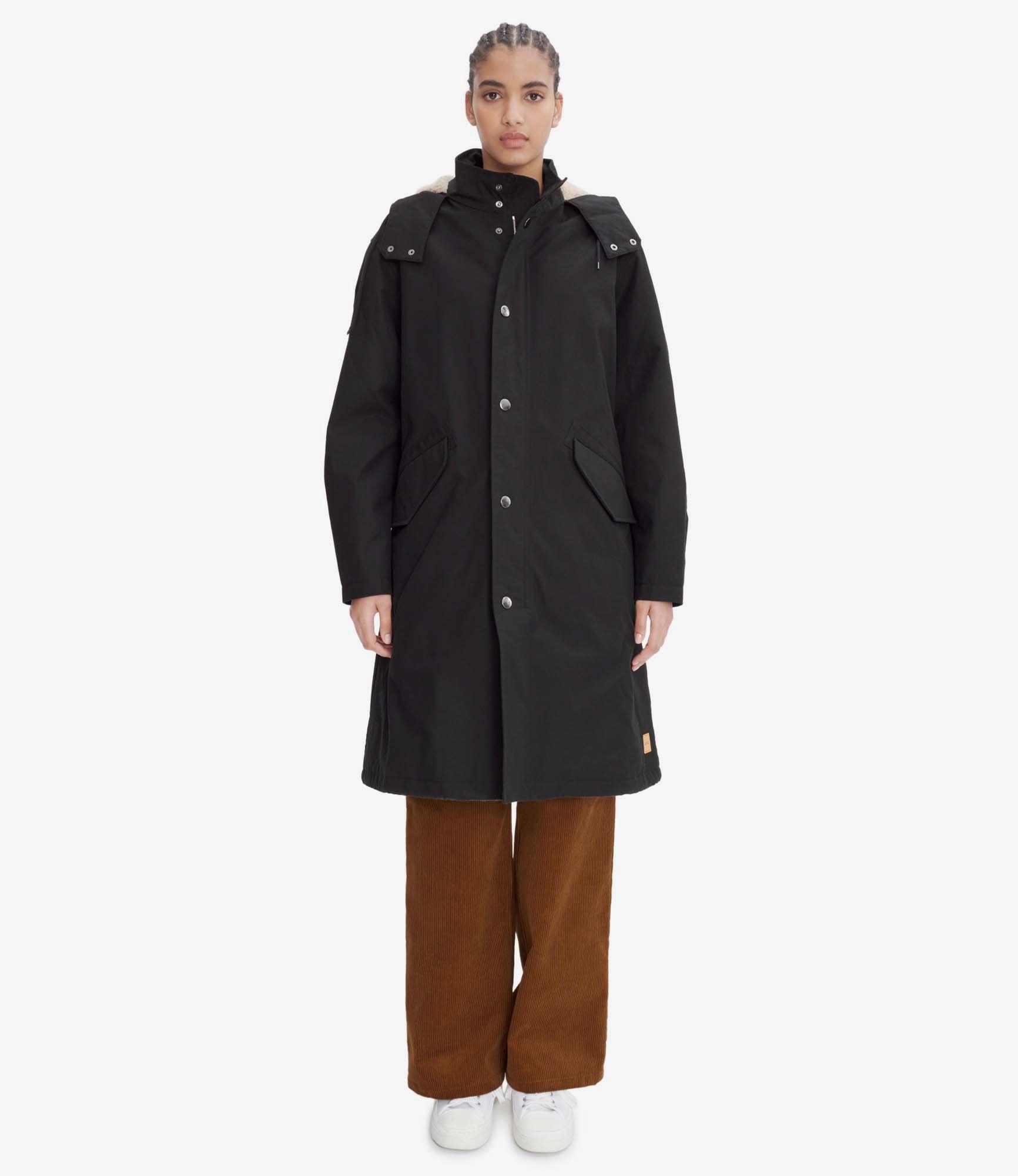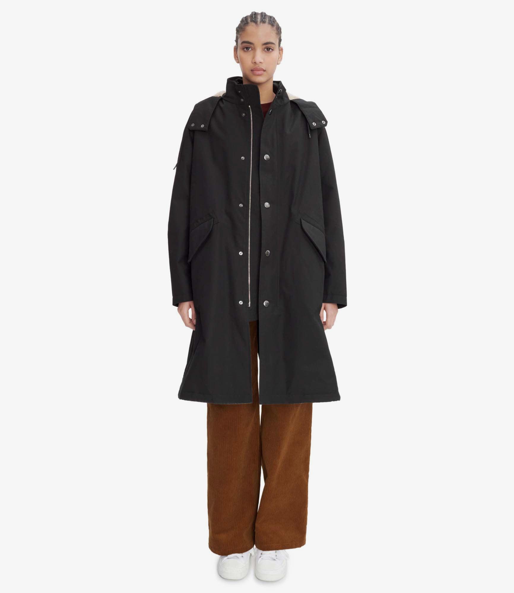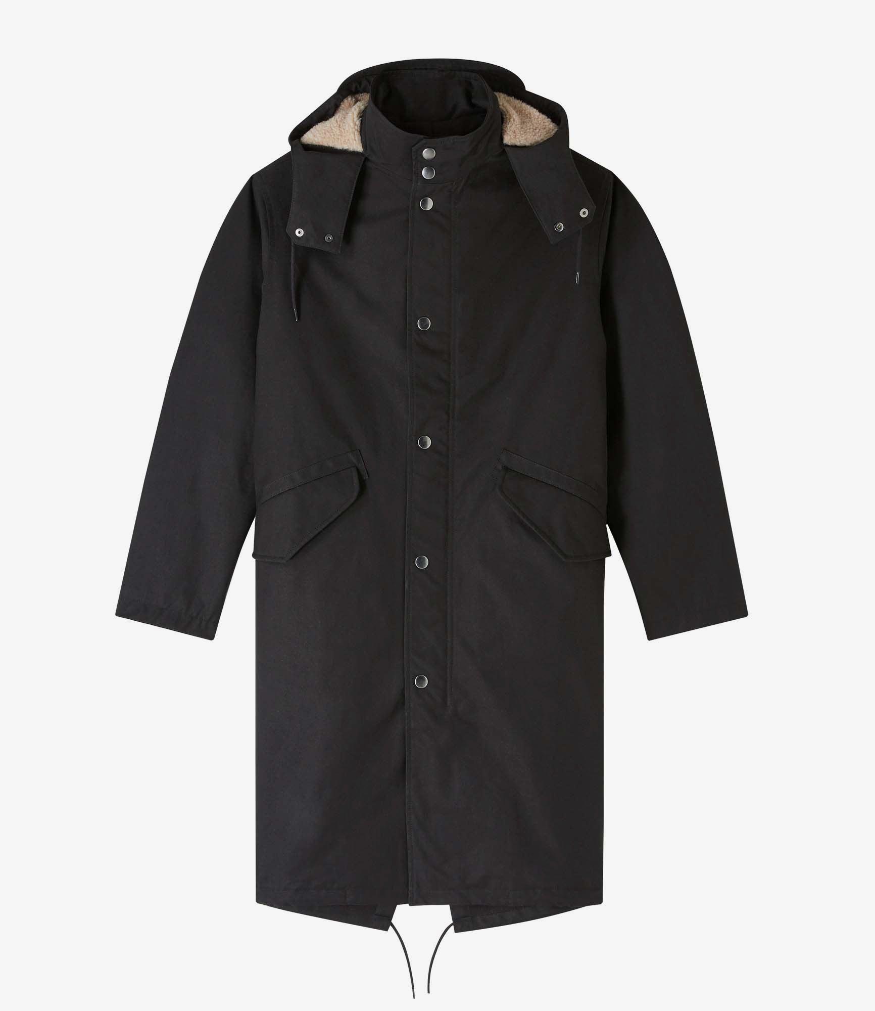 A.P.C. parka.- Water-repellent English waxed cotton. - Unisex model. - Straight cut with a slightly loose fit. - Stand-up collar with snap closure. - Two snap flap pockets. - Hood with visor, high collar and tone-on-tone drawstrings. - Polar fleece and padded lining. - Faux fur-lined hood. - Double-zip flap on the closure. - A.P.C. patch in faux leather. - One inside pocket. - Single vent.