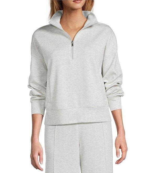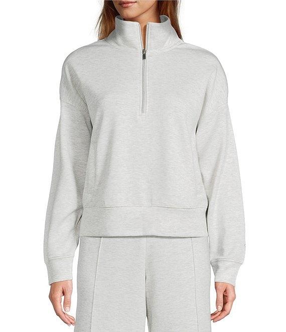 From Antonio Melani Active, this sweatshirt features: Heather interlock fabrication Stand collar neckline Long sleeves Half zip closure Pullover construction Side pockets Approx. 22" length Rayon/polyester/elastane Machine wash/dry flat Imported.