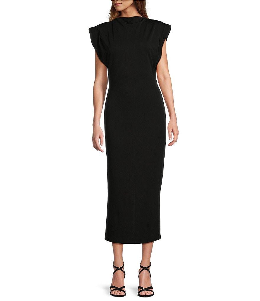 From Antonio Melani, this dress features: Matte jersey fabrication Sheath silhouette Mock neckline Dropped cap sleeves Ruched detail at chest Fitted bodice Classic fit Midi length Straight hemline Pullover construction Center back invisible zipper with hook & eye closure Approx. 51" length Machine wash cold/ dry flat Imported.