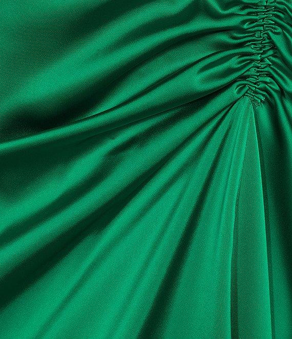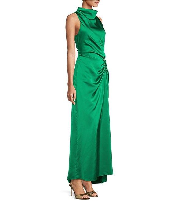 From Antonio Melani, this dress features: Fluid satin fabrication Sleeveless Cowl neckline Side ruching Lined Zip back closure Approx. 59" length Polyester Dry clean Imported.