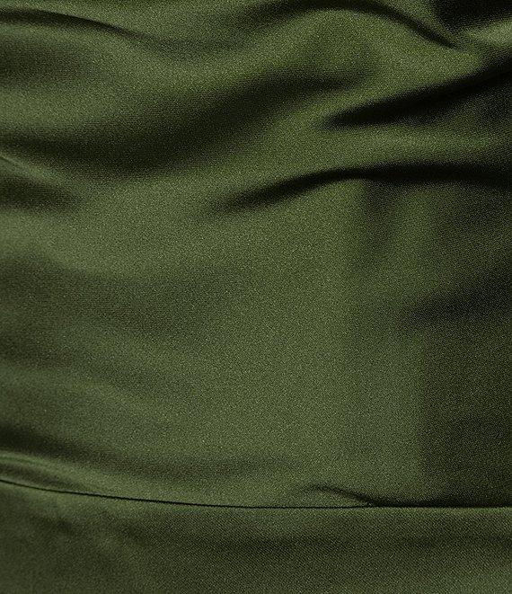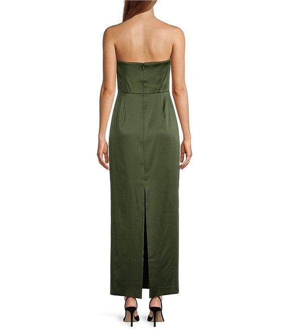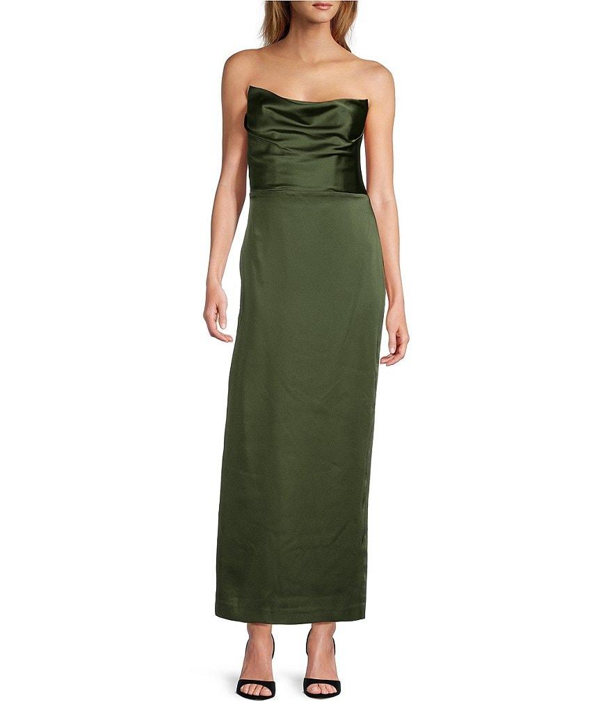 From Antonio Melani, this dress features: Stretch satin fabrication Sheath silhouette Cowl neckline Strapless Ruched bodice Fully lined Midi length Back zipper with hook & eye closure Approx. 47" length Polyester/elastane Professional dry cleaning only Imported.