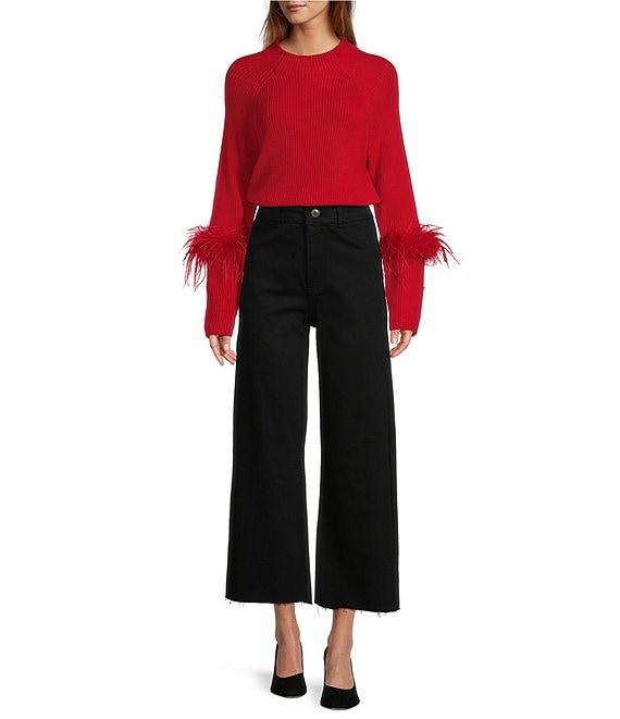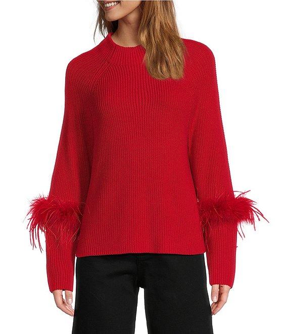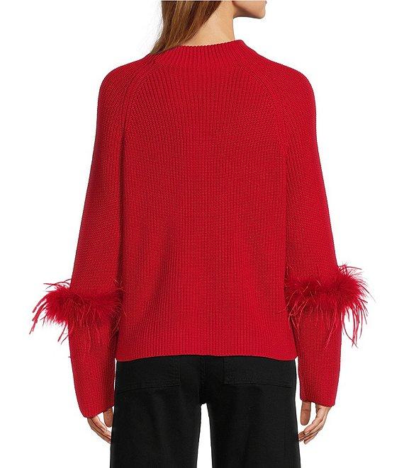 From Antonio Melani, this sweater features: Wool Blend Sweater Knit Fabrication Sweater Silhouette Crew Neckline Long sleeves Feather Trim Detail above cuffs Classic Fit Average Length Straight Hemline Pullover construction Approx. 20.5" length Polyester/acrylic/nylon/wool/ostrich features Spot clean Imported.