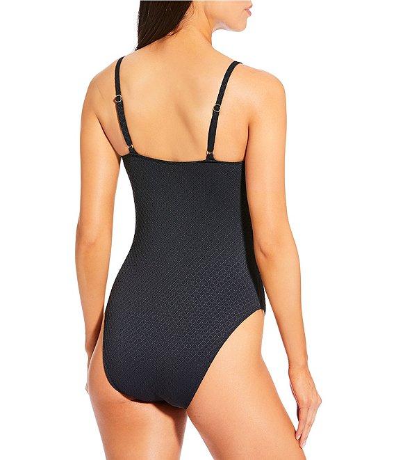 From Antonio Melani x Style by Simkins, this one-piece swimsuit features: One-piece bandeau silhouette Square neckline Textured fabrication Soutache embroidery detail Over-the-shoulder adjustable straps Light bust support Lined Pull-on construction Nylon/spandex Hand wash Imported.