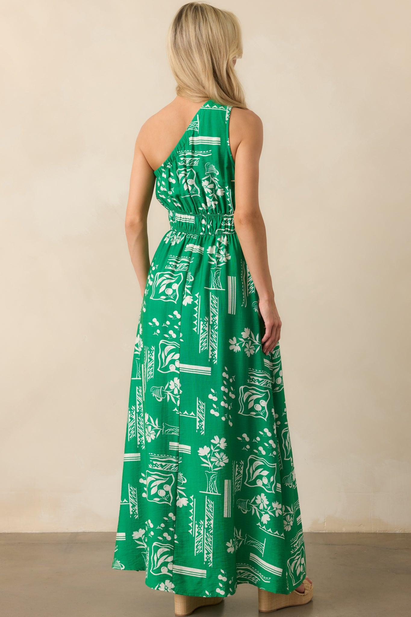 The Anything Goes Green One Shoulder Geometric Floral Print Maxi Dress brings a carefree, tropical spirit to whatever’s on the agenda. Bold but relaxed, it’s made for easy moments, warm vibes, and going with the flow. This green maxi dress features a white geometric floral print throughout, elastic waist, green mini length lining, side leg slit, and functional pockets.