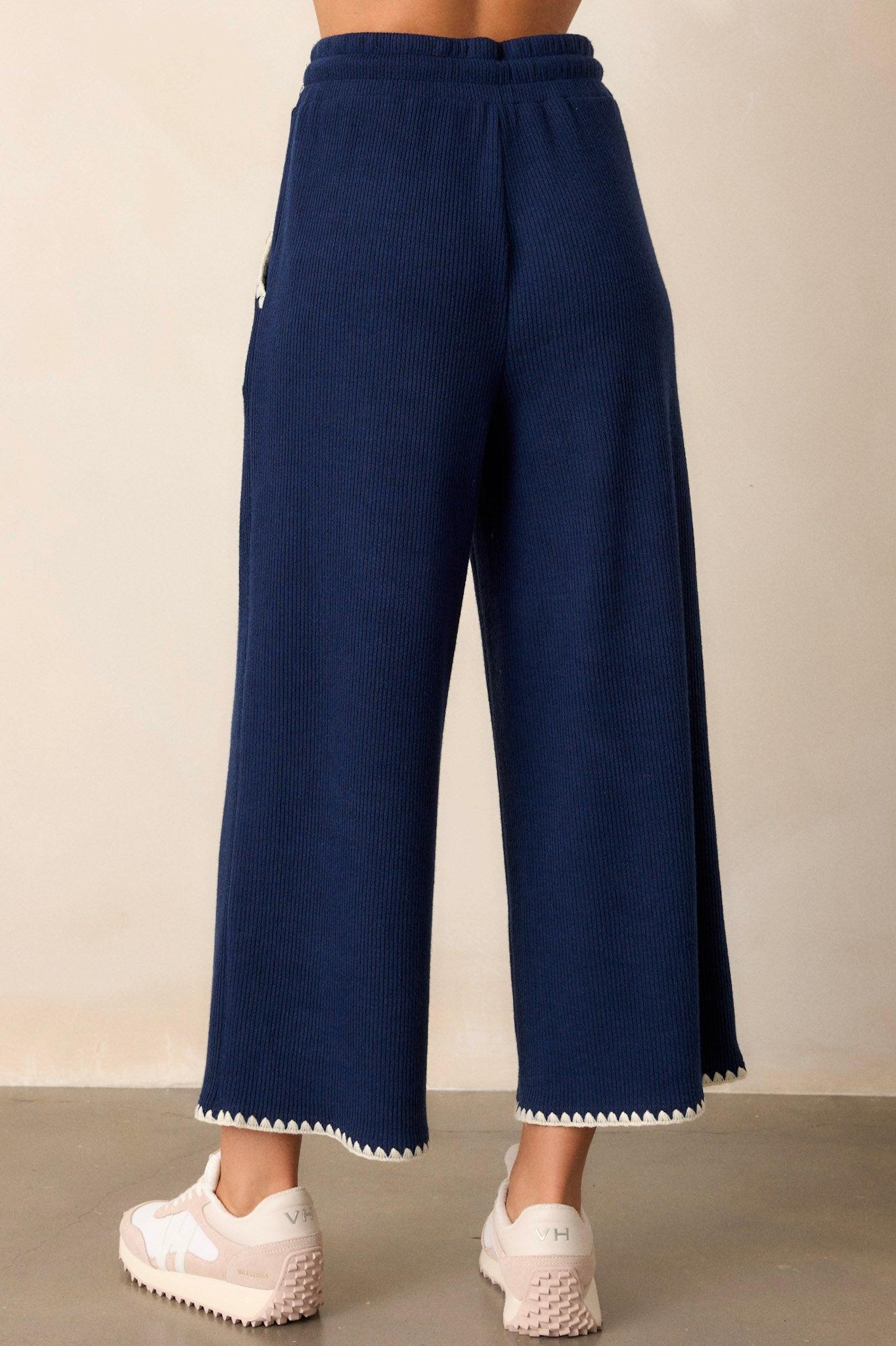 Elevate your casual style with our Anytime Now Navy Blanket Stitch Wide Leg Pants. These pants feature a stylish and comfortable wide leg design, perfect for any occasion. The blanket stitching adds a unique touch to your look, while the stretchy material ensures all-day comfort. Upgrade your wardrobe now! These navy pants feature an elastic waistband, an adjustable drawstring, ivory blanket stitch detailing, functional hip pockets, a soft knit material, and a wide leg. 75% Polyester, 20% Rayon & 5% Spandex Unlined Hand Wash Cold Manufactured in China Designed in The USA Model is wearing a size small Model is 5'8"