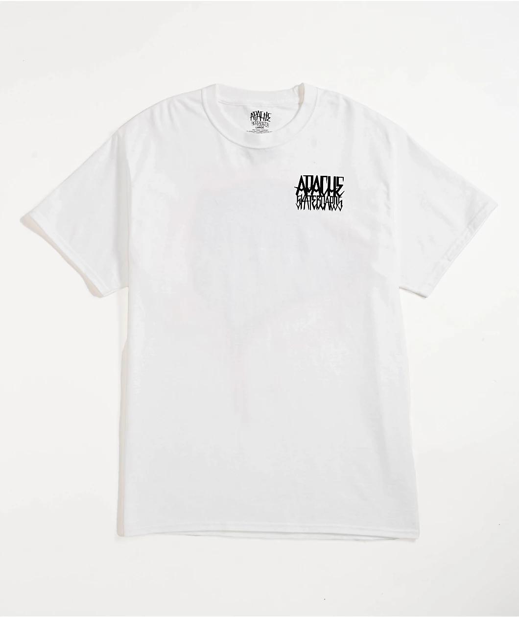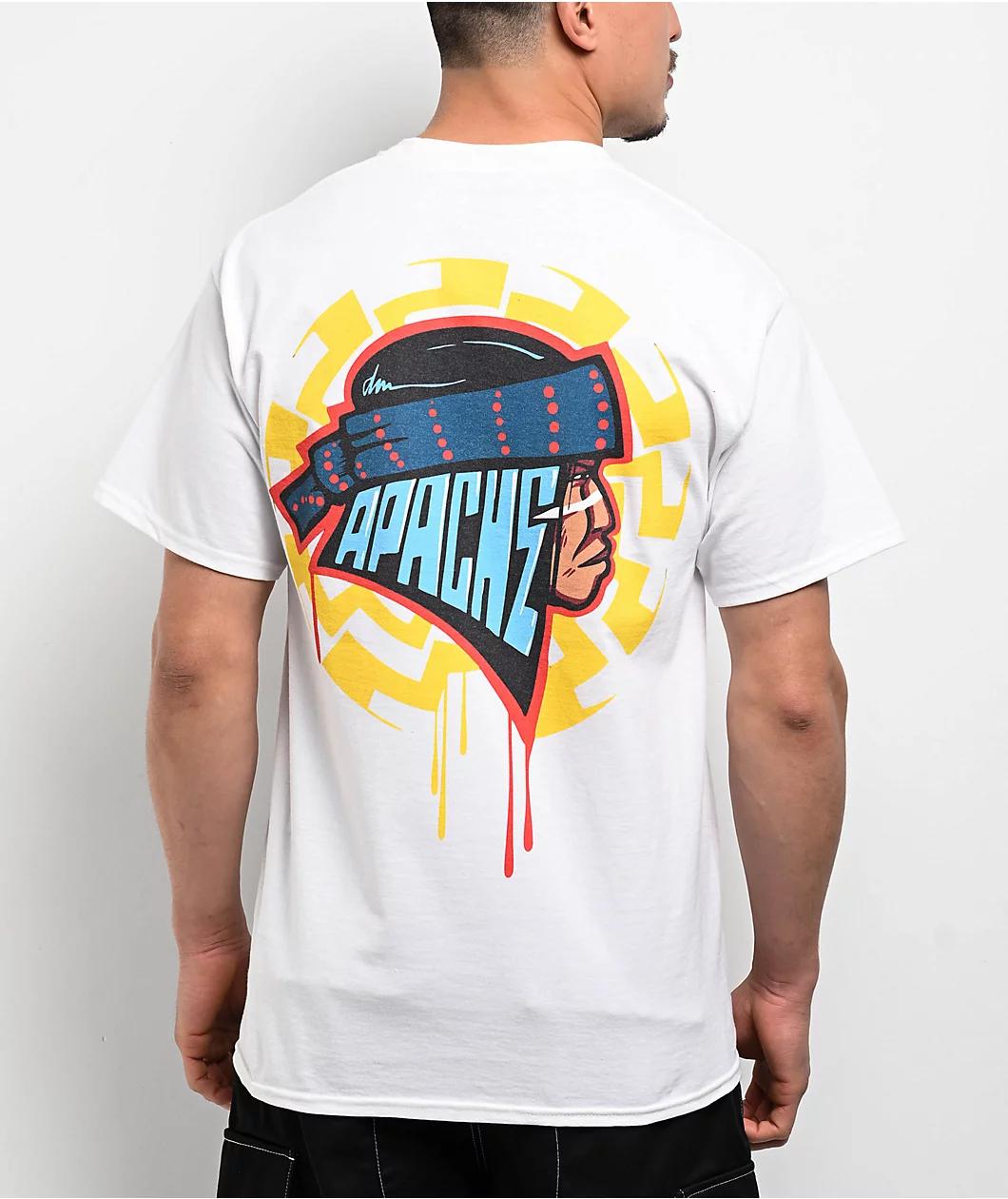 Native-founded skate brand Apache presents the Basket t-shirt in a casual white colorway. The back features art of an indigenous warrior with blue branding serving as the highlights in his hair for a look that mixes modern and classic styles.