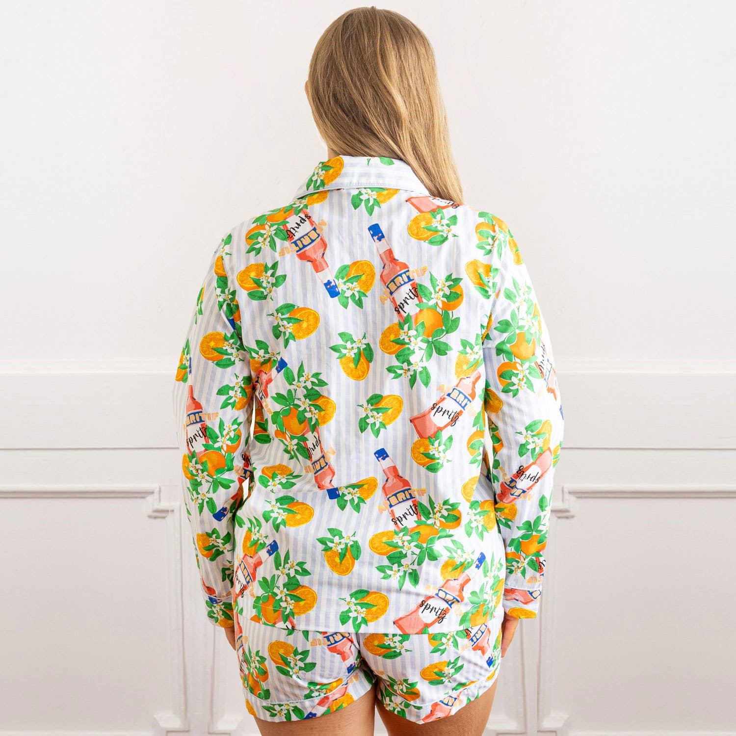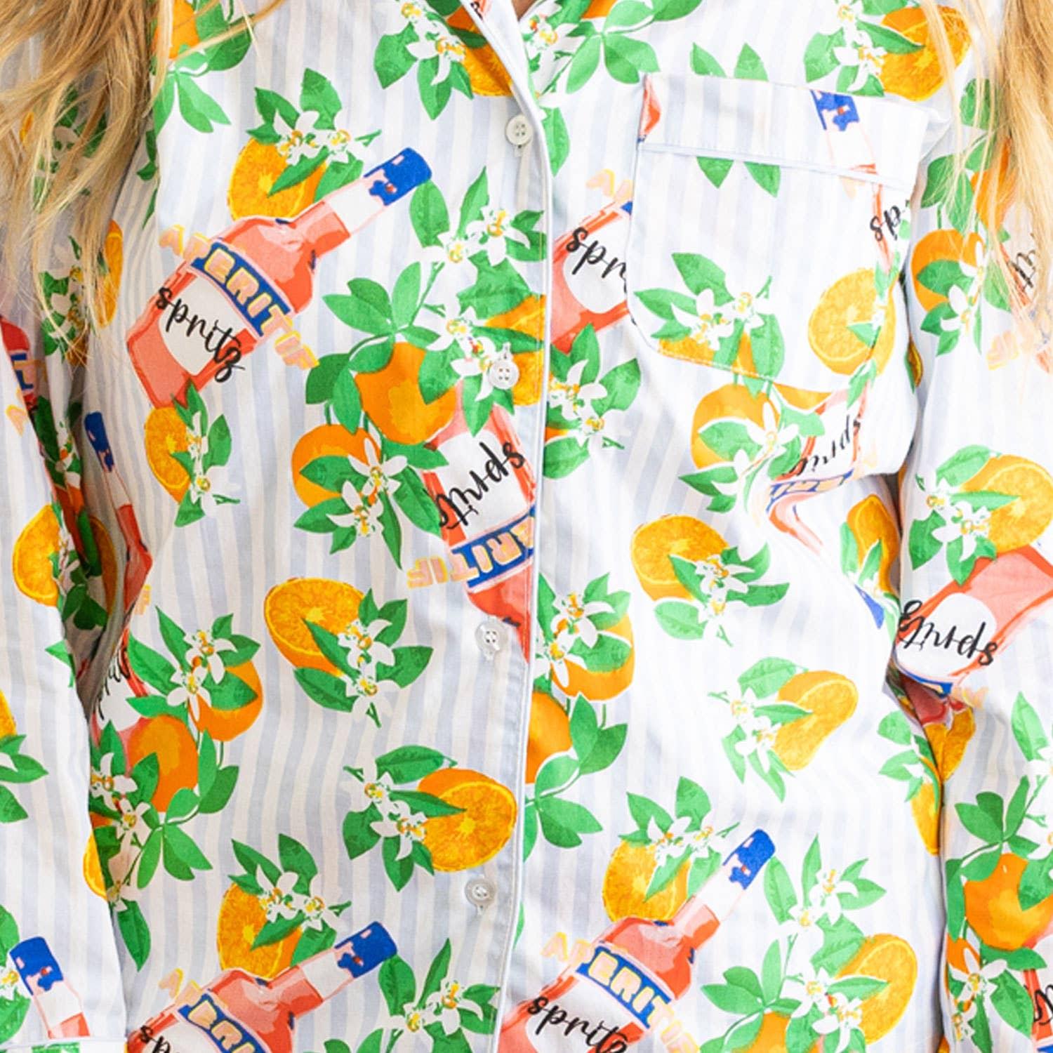 Sleep in style with our Apéritif Stripe Pajama Set. Crafted from 100% woven cotton, this set is designed to keep you comfortable so you can make the most of your rest. This elegant short set features a button-front long sleeve top & drawstring waist shorts with the orange blossom & Aperol spritz print, making it the perfect choice for any occasion, especially vacation. Slip into your own piece of elegance with our Apéritif Stripe Pajama Set today!
