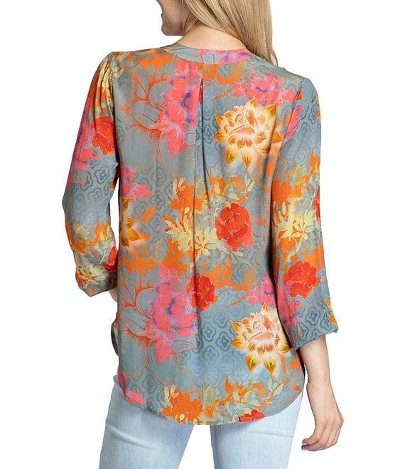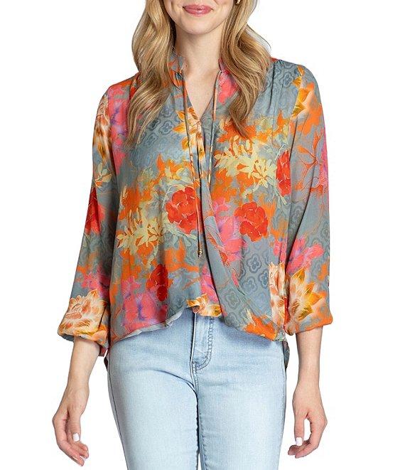 APNY Woven Floral Print V-Neck 3/4 Sleeve Tassel Tie Blouse